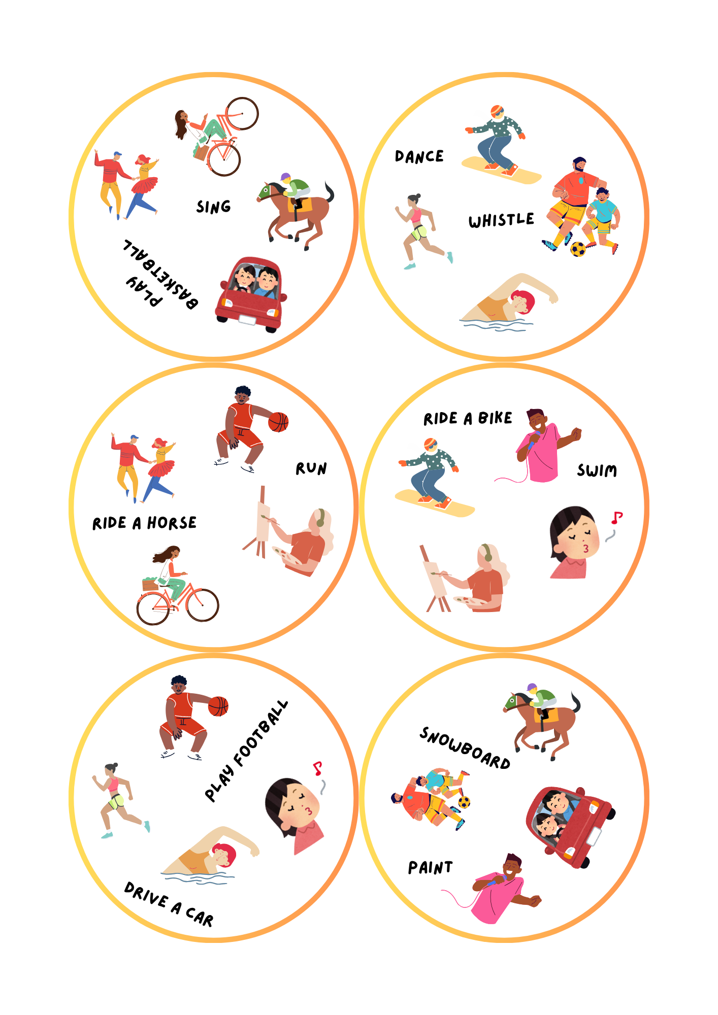 Materiał obejmuje czasowniki takie jak: sing, play football, play basketball, paint, ride a horse, ride a bike, swim, drive a car, whistle, run, dance, snowboard. Uczniowie uczą się mówić o tym, co potrafią i czego nie potrafią robić w naturalny i angażujący sposób.