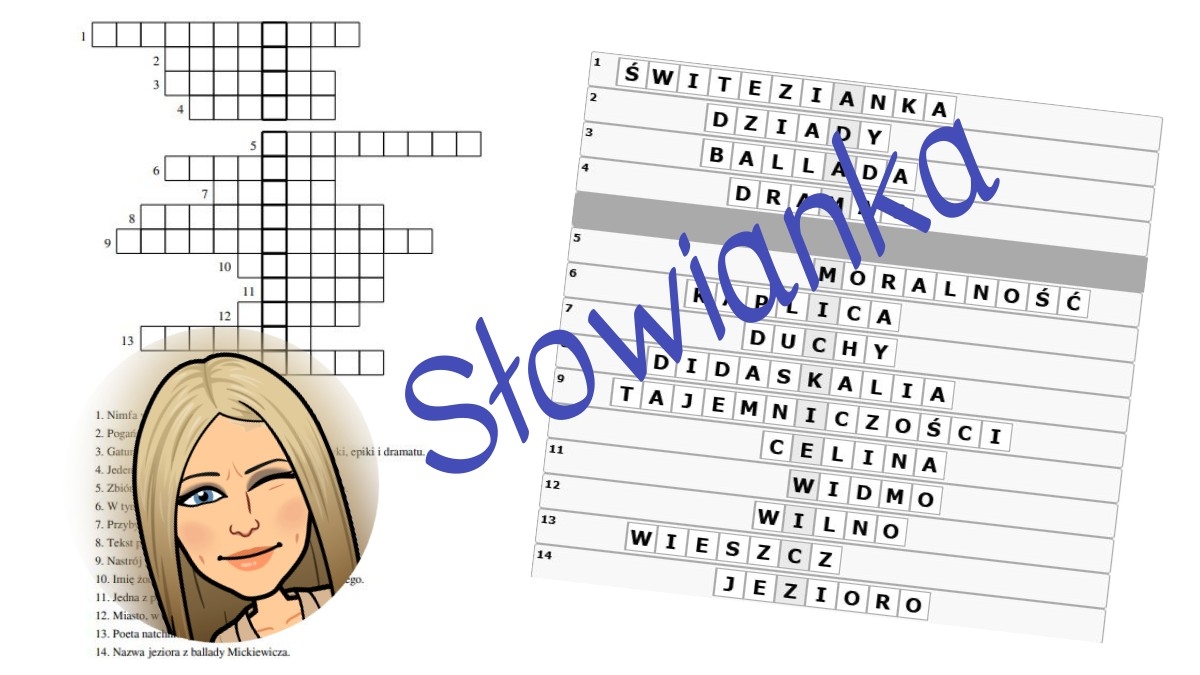 Krzyżówka na temat życia i twórczości Adama Mickiewicza dedykowana dla uczniów klasy 7 Szkoły Podstawowej. Do wykorzystania np. na lekcji powtórzeniowej - systematyzuje wiadomości z zakresu biografii wieszcza oraz pojęć takich jak dramat, ballada oraz utworów "Świtezianka" oraz "Dziady" cz. II.