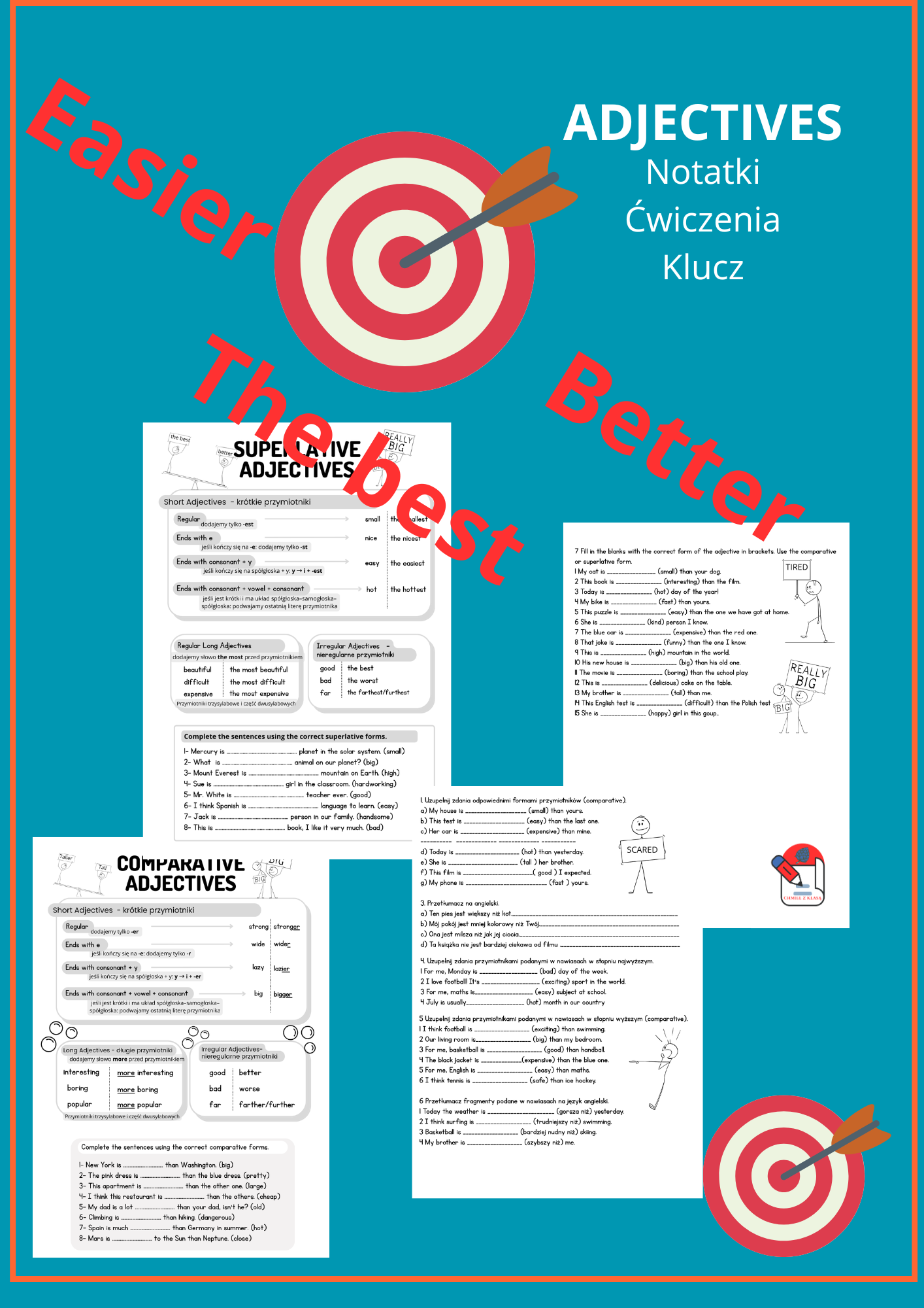 Przejrzysta teoria: Wizualne notatki tłumaczące zasady dla przymiotników krótkich (końcówki -er, -est), długich (more, the most) oraz tych nieregularnych, jak good czy bad.