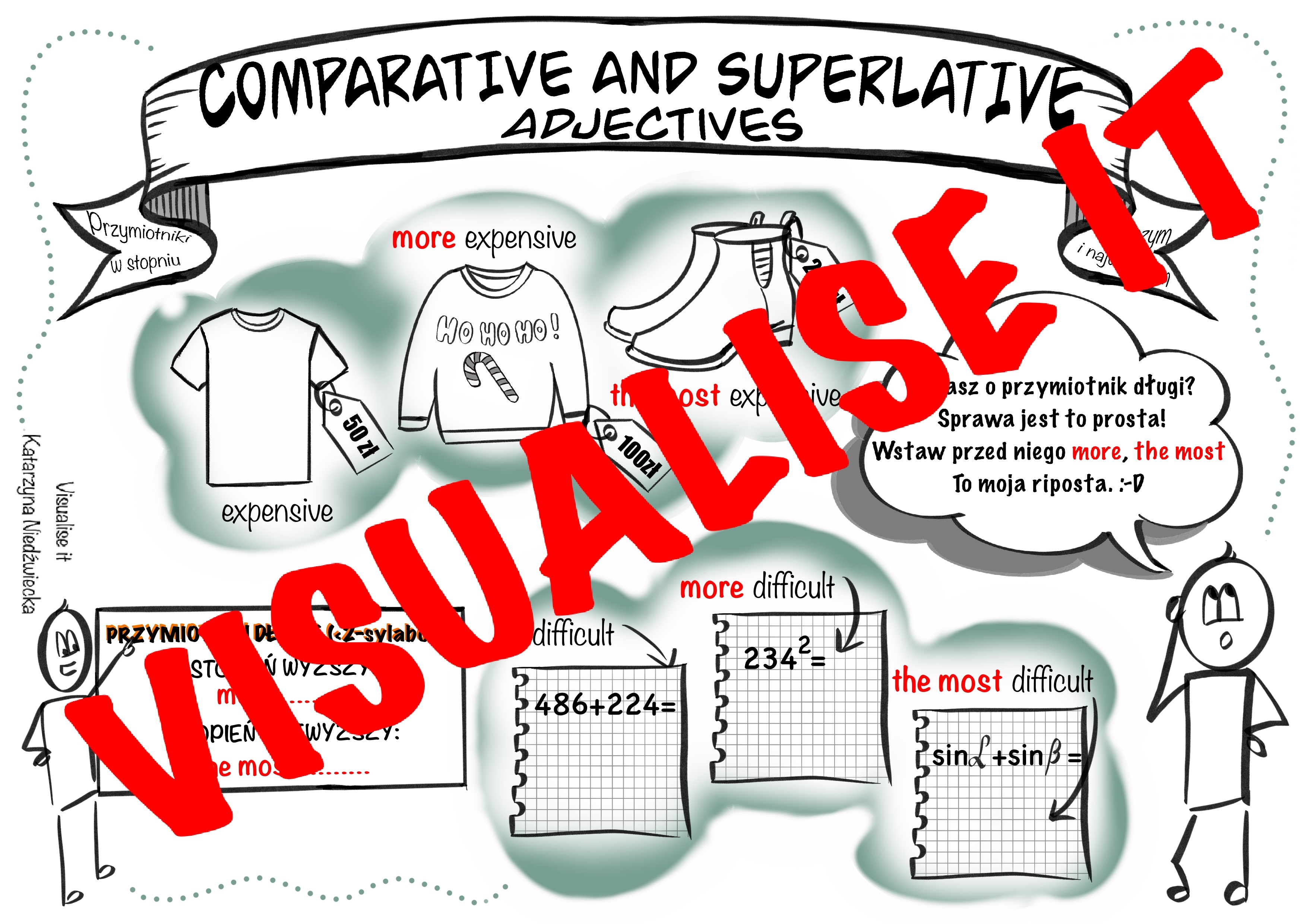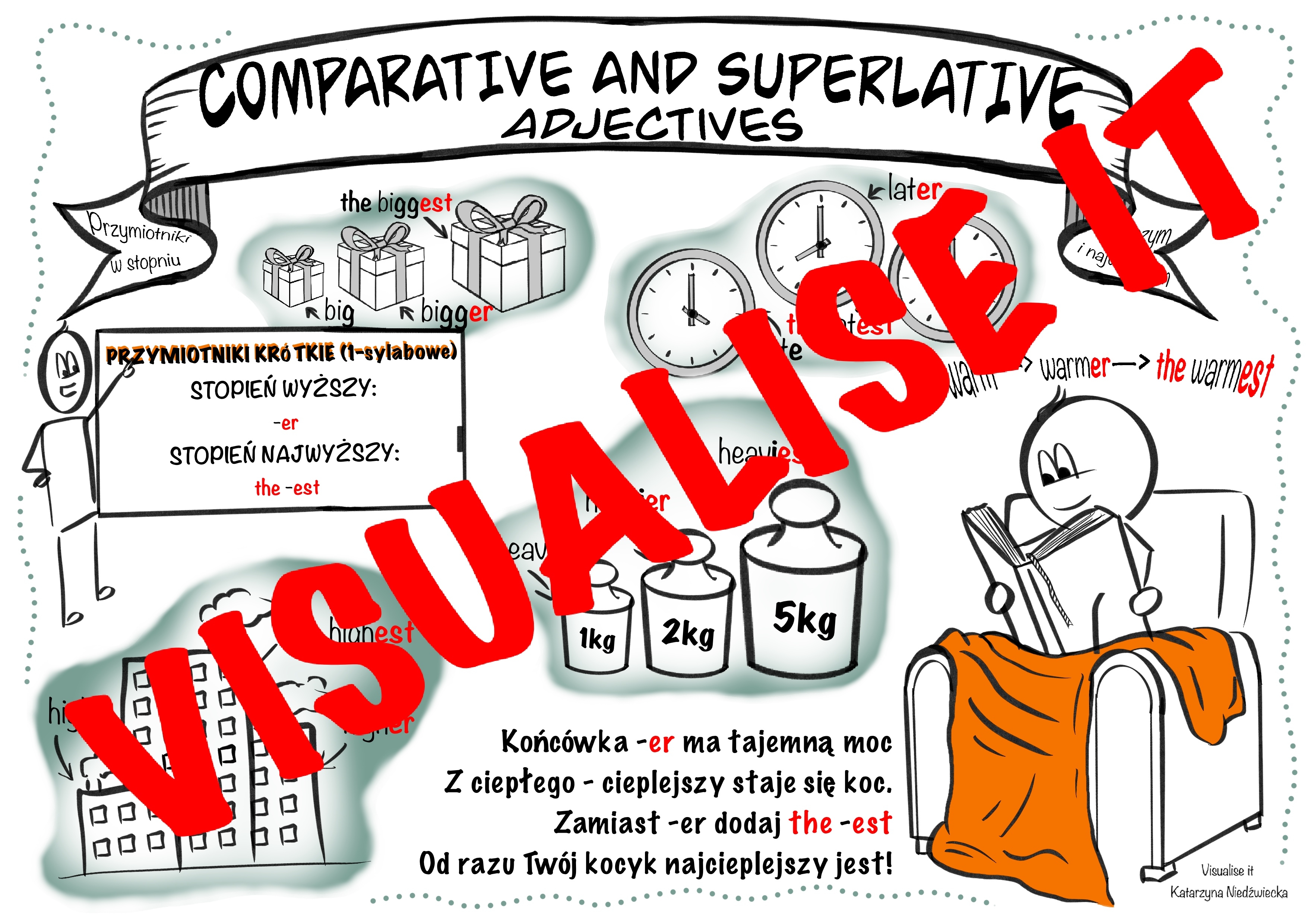 – układania zdań z przymiotnikami w stopniu równym, wyższym i najwyższym, z konstrukcją “as…as”