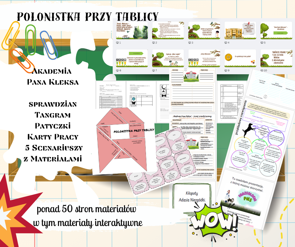 Kompletny pakiet cyfrowych atrakcyjnych wizualnie materiałów do „Akademii Pana Kleksa”;