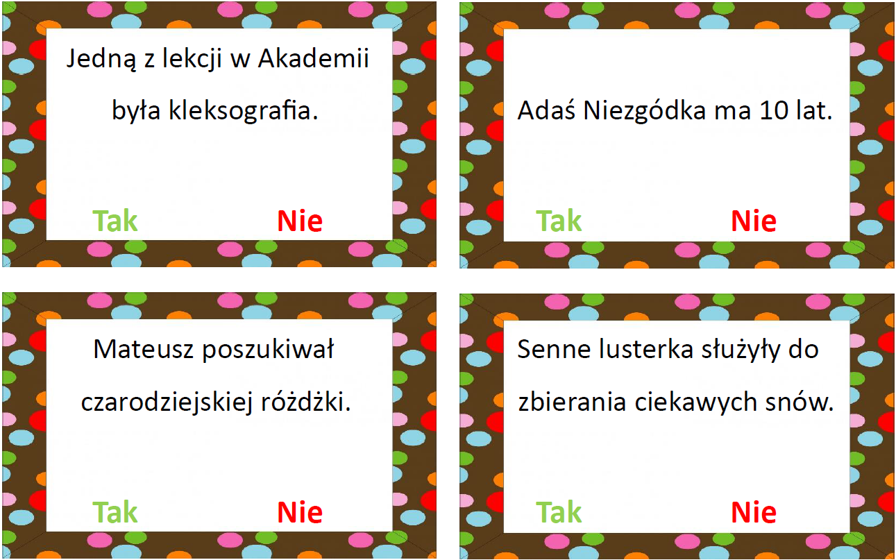Zestaw 50 kart do lubianej przez dzieci gry z lektury “Akademia Pana Kleksa”. Zadaniem dzieci jest określenie na przygotowanych wcześniej kartkach (TAK, NIE), czy przeczytane przez nauczyciela zdanie jest prawdziwe (podnoszą kartkę TAK) czy fałszywe (podnoszą kartkę NIE).