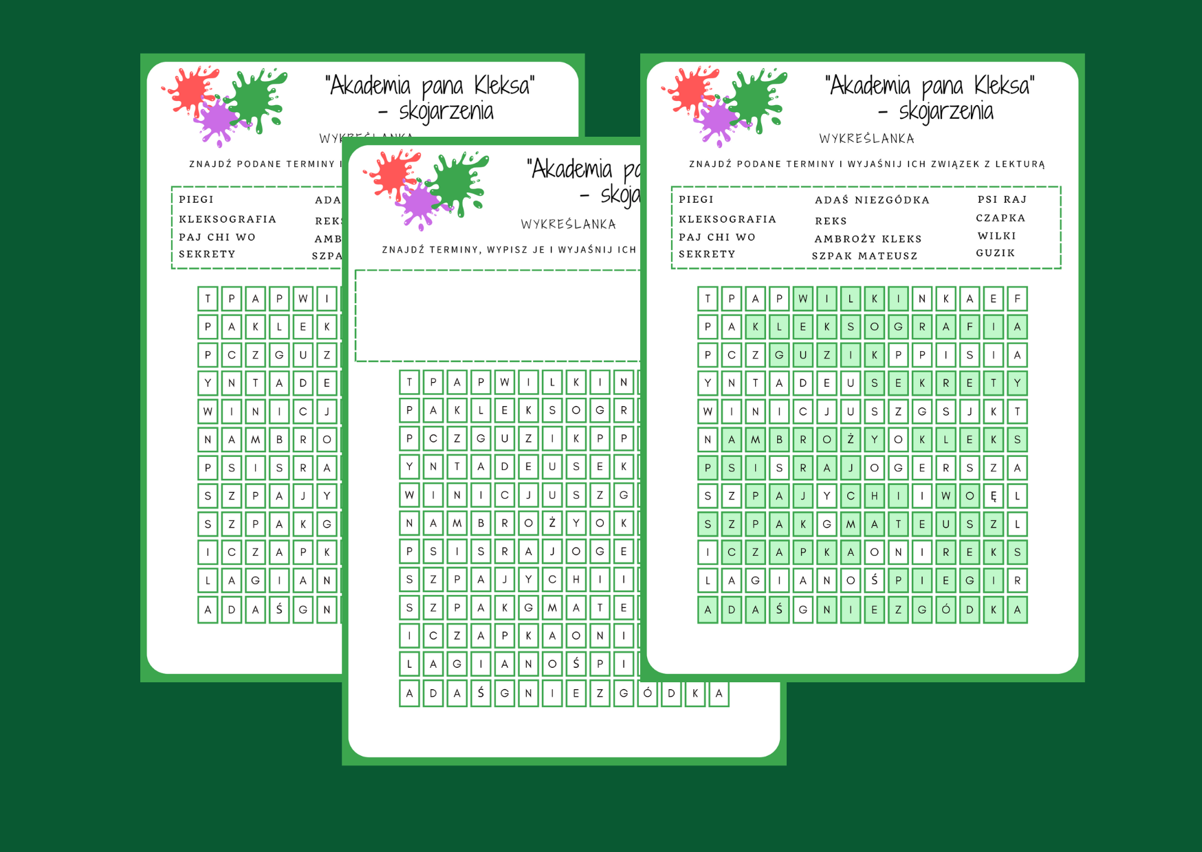 Materiał zawiera wykreślankę dotyczącą „Akademii pana Kleksa" (3 wersje: z odpowiedziami, bez odpowiedzi, bez wyrazów do odnalezienia).