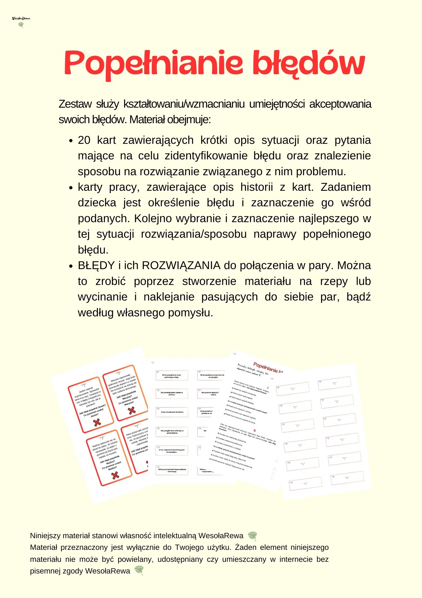 Zestaw służy kształtowaniu/wzmacnianiu umiejętności akceptowania swoich błędów. Materiał obejmuje: