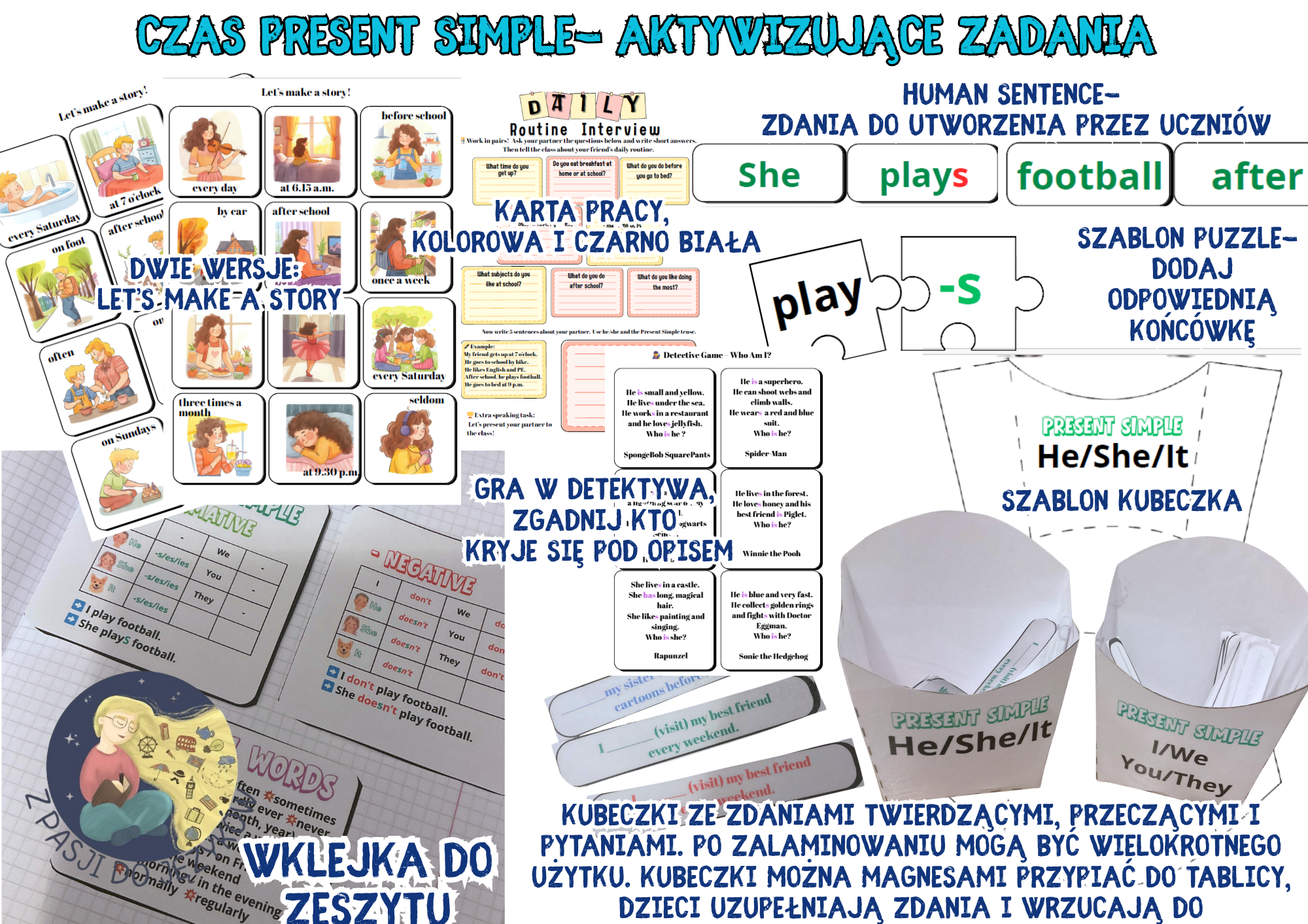 Zestaw pomocy do nauki czasu Present Simple dla klas 4-8 szkoły podstawowej.