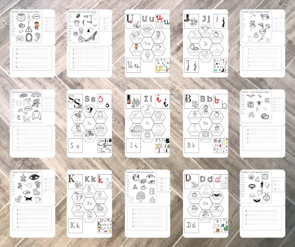 Alfabet - ćwiczenia grafomotoryczne, wklejki A, B, D, I, J, K, S, U Zestaw do ćwiczeń grafomotorycznych, wklejki, rozróżnianie liter, pismo drukowane i ręczne, dopasowywanie podpisów do obrazków. Wsparcie w nauce liter alfabetu. W sumie 34 strony zadań do wykonania - na miniaturze jedynie wybrane, poglądowe strony :) Litery: ?A, a ?B, b ?D, d ?I, i ?J, j ?K, k ?S, s ?U, u