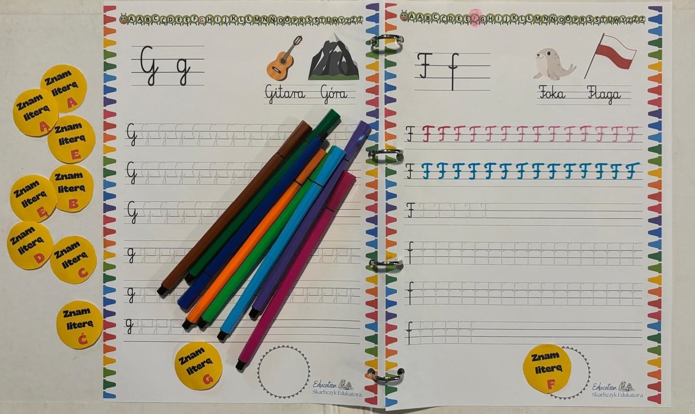 • Etykiety motywacyjne: Inspirujące hasło, takie jak "Znam literę 'A'!", wzmacniają poczucie własnej wartości i zachęcają do dalszej nauki.