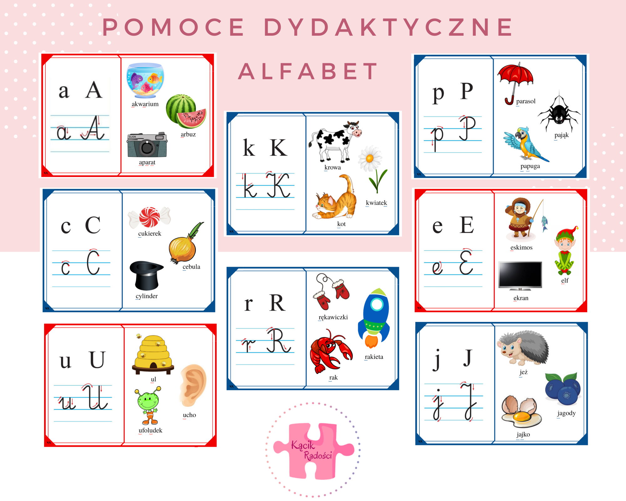 ZESTAW ALFABET Plansze edukacyjne - pomoce. Zestaw zawiera 32 karty w formacie A4. Zestaw zawiera następujące litery: A, Ą, B, C, Ć,D, E, Ę, F, G, H, I, J, K, L, Ł, M, N, Ń, O, Ó, P, R, S, Ś, T, U, W, Y, Z, Ź, Ż. Na każdej karcie znajduje się litera oraz kilka przedmiotów zaczynających się na daną głoskę.