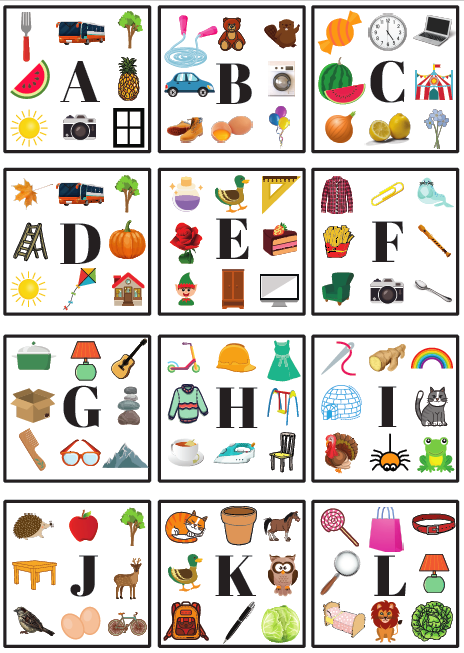 Alfabet - słuch fonemowy - to karty służące do rozróżniania głosek w nagłosie i śródgłosie. Uczeń nazywa obrazki a następnie zaznacza te, w których słyszy daną głoskę na karcie. Karty mogą być pomocne przy wprowadzaniu liter oraz przy ćwiczeniach słuchu fonemowego (rozróżnianie głosek).