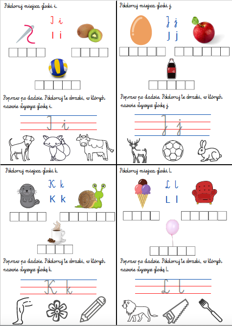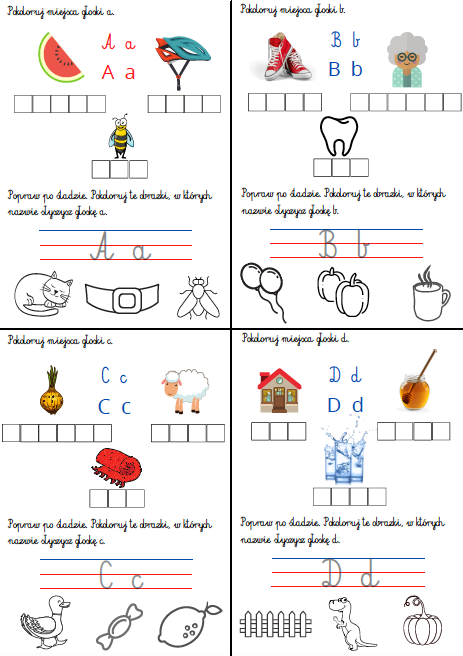 Alfabet - zadania: pomoc przeznaczona dla uczniów klas 1, przedszkoli, która przyda się przy wprowadzaniu liter oraz przy ćwiczeniu percepcji słuchowej. Zadaniem ucznia jest zlokalizowanie danej głoski w podanych wyrazach. Zestaw zawiera następujące litery: a, b, c, ć, d, e, f, g, h, i, j, k, l, ł, m, n, ń, o, p, r, s, ś, t, u, w, z, ź, ż