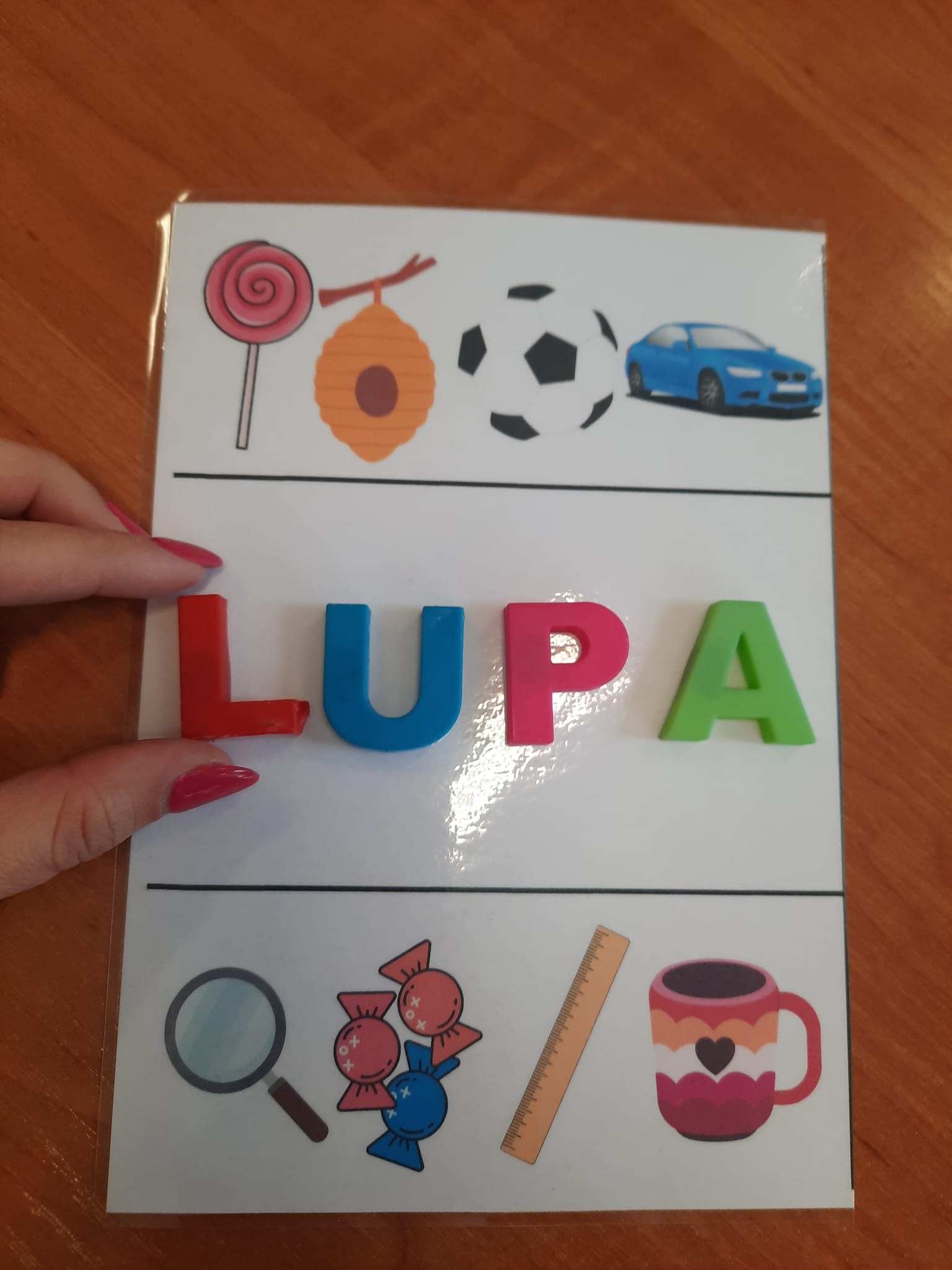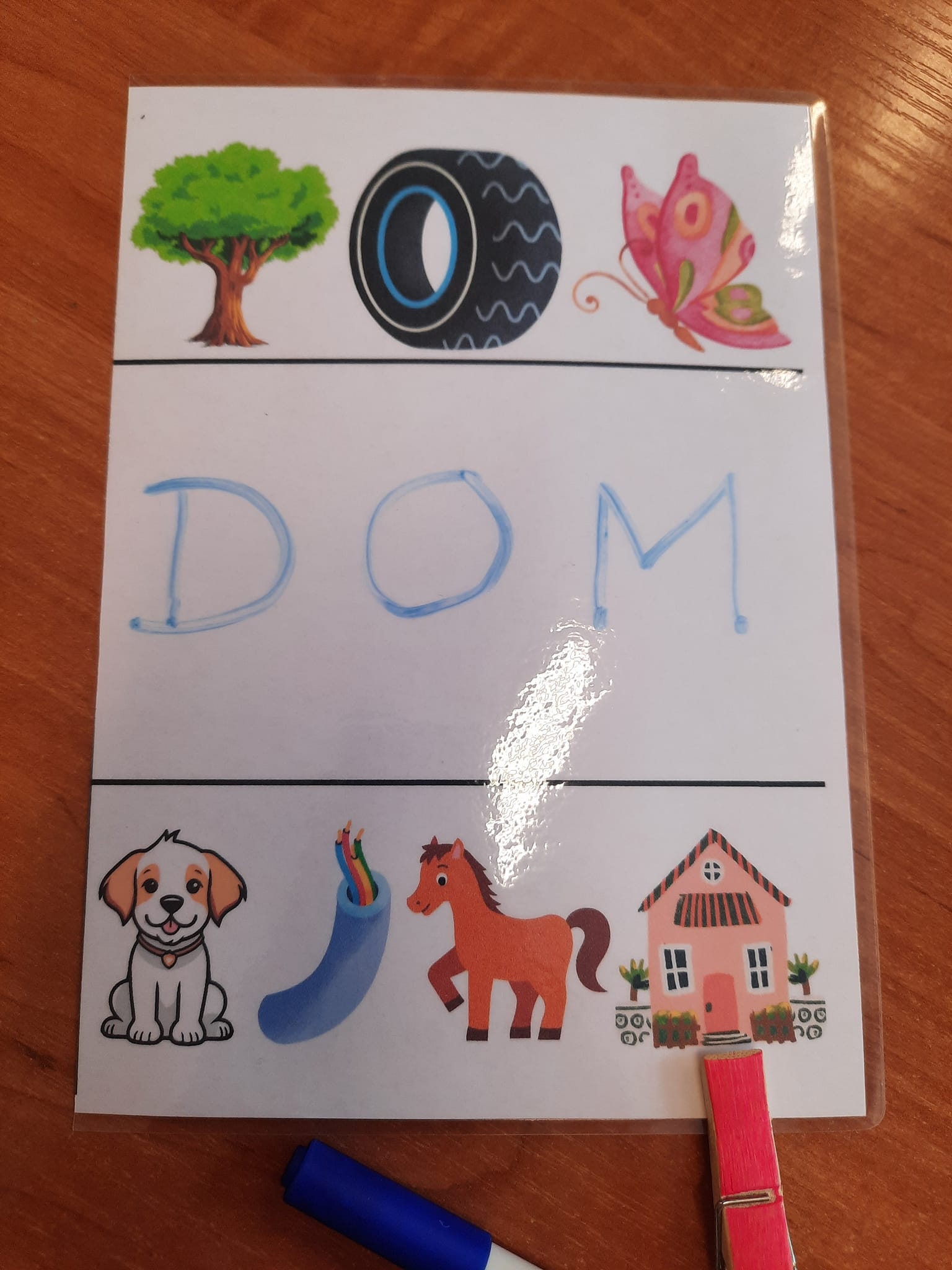 Zadanie można wykonać układając literki bądź też zapisując je np. suchoscieralnym mazakiem.