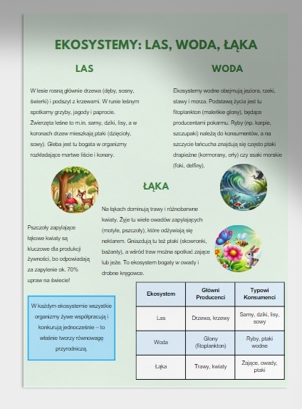 Poznaj fascynujący świat przyrody dzięki kompleksowemu materiałowi edukacyjnemu, który w atrakcyjny sposób przybliża najważniejsze zagadnienia ekologiczne i przyrodnicze. Ten starannie opracowany zestaw treści idealnie sprawdzi się jako pomoc dydaktyczna dla nauczycieli, rodziców i dzieci, a także jako inspiracja do zajęć szkolnych i domowych.