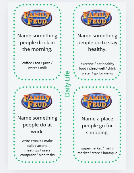 Materiał zawiera karty do gry w typie "Familiady". Kilka różnych kategorii pytań pozwala na powtórzenie poznanego na lekcjach słownictwa. Może to stanowić fajne urozmaicenie lekcji, utrwalenie materiału, jak również powtórzenie przed egzaminem 8-klasisty. Wewnątrz znajduje się ewentualna instrukcja (nauczyciele mogą wykorzystać materiał według własnego uznania), oraz karty niezbędne do przeprowadzenia rozgrywki.