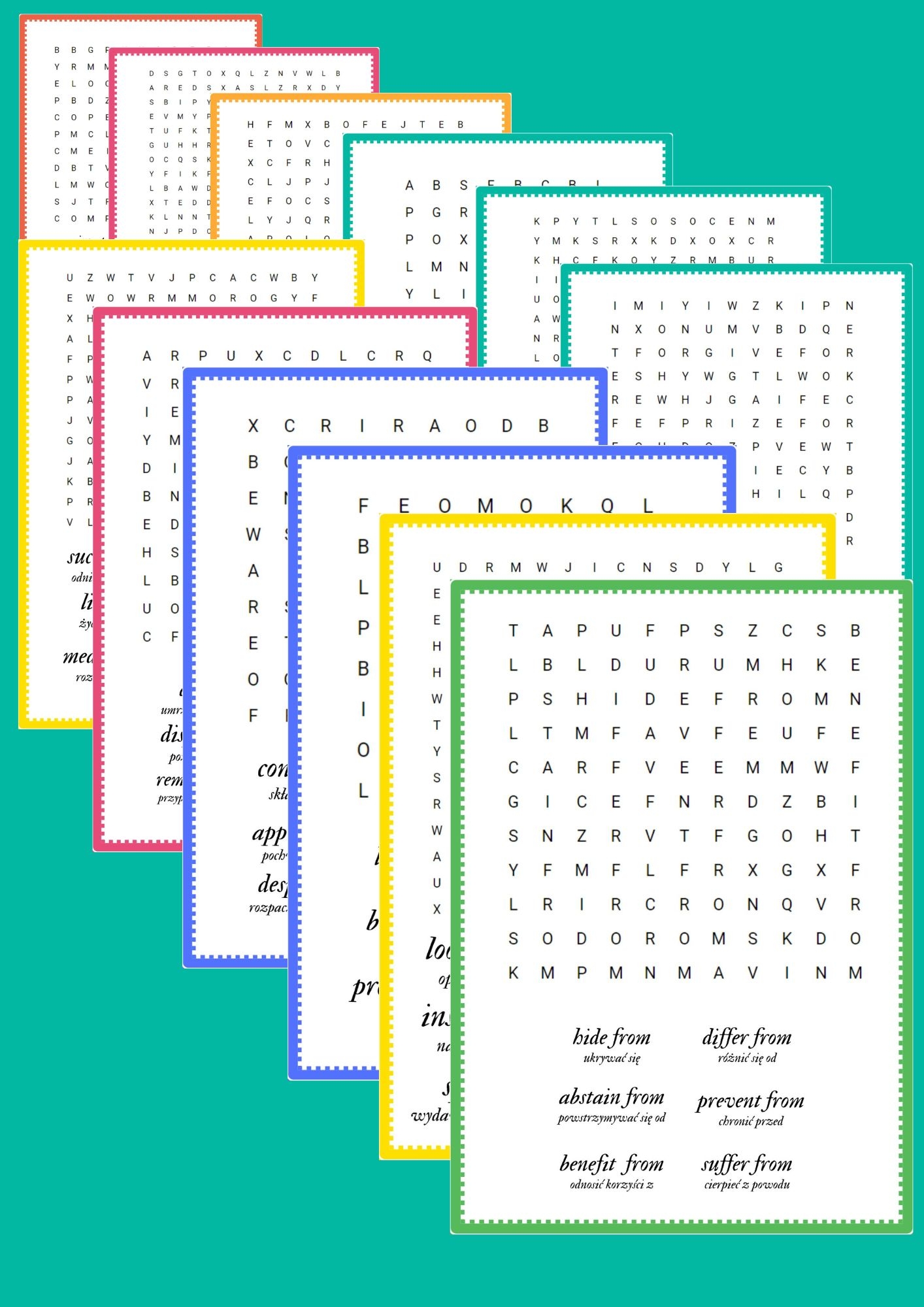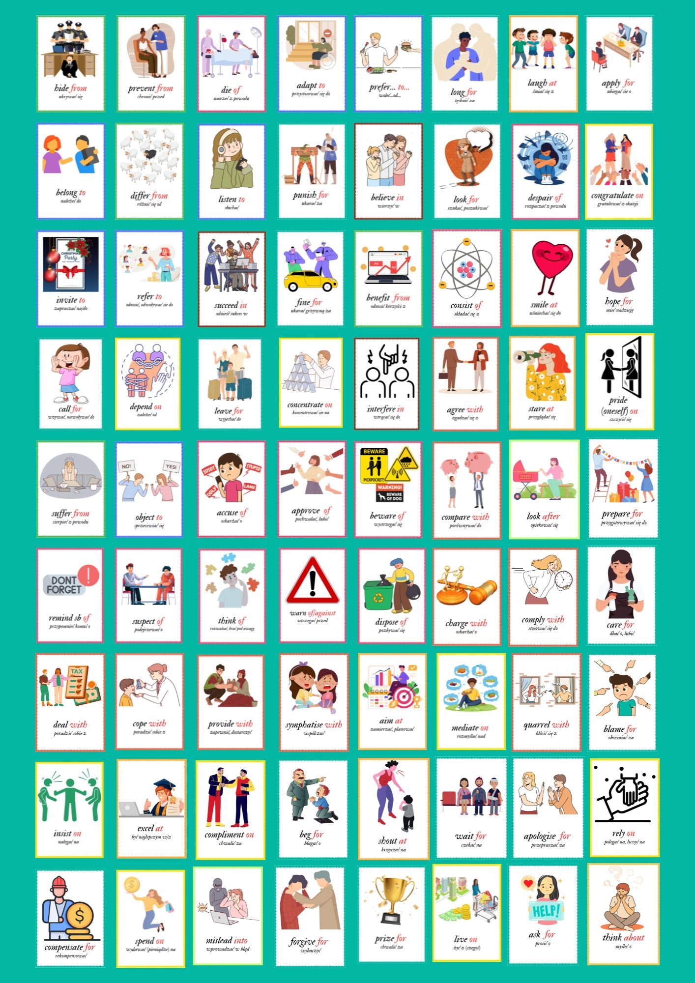 Zestaw „Czasownik + przyimek” to praktyczne i atrakcyjne materiały dydaktyczne do nauki jednych z najtrudniejszych elementów języka angielskiego – czasowników z przyimkami.