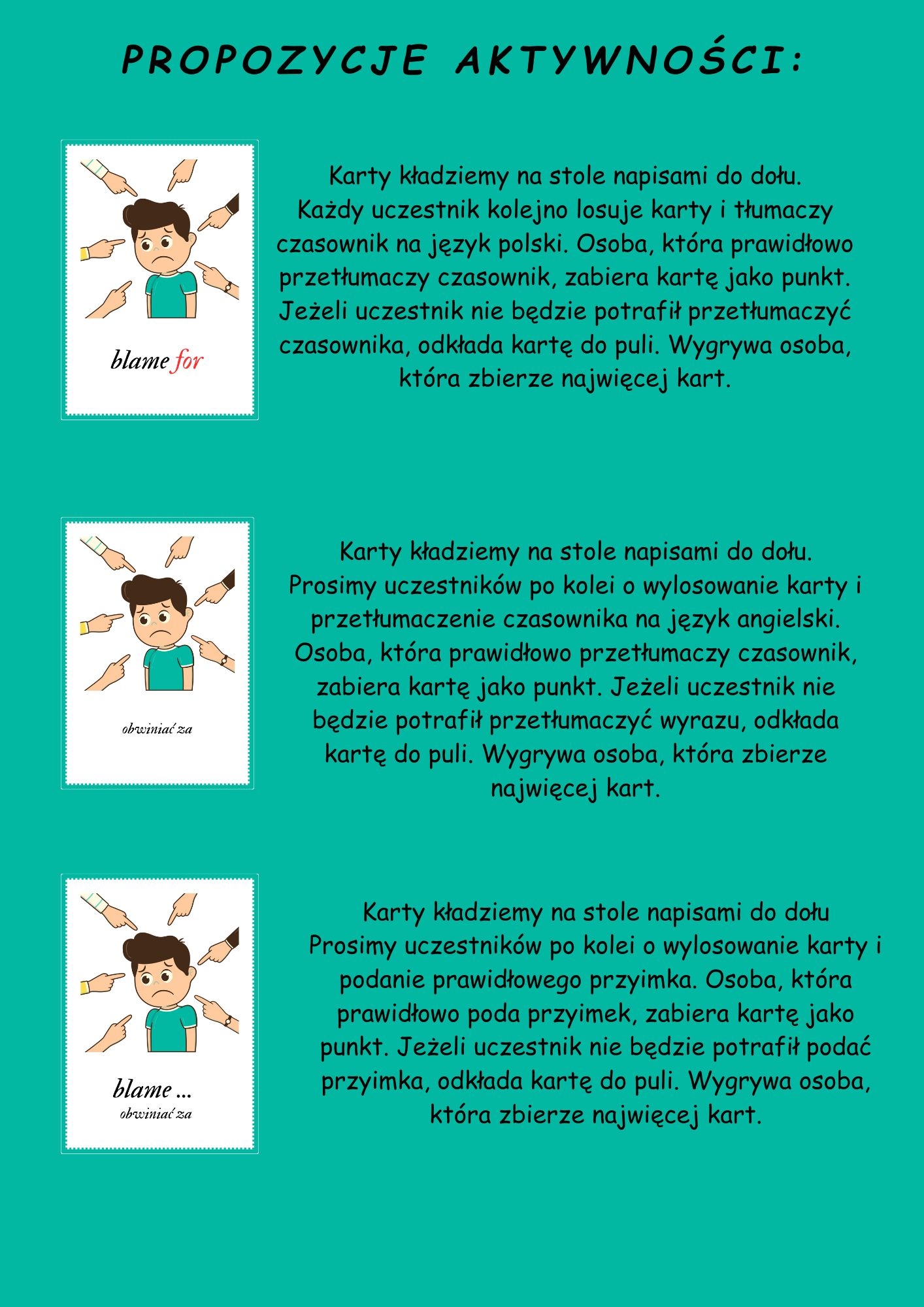 Zestaw wspiera naukę przez zabawę, aktywizuje uczniów i pomaga im utrwalić poprawne konstrukcje językowe w naturalnym kontekście.