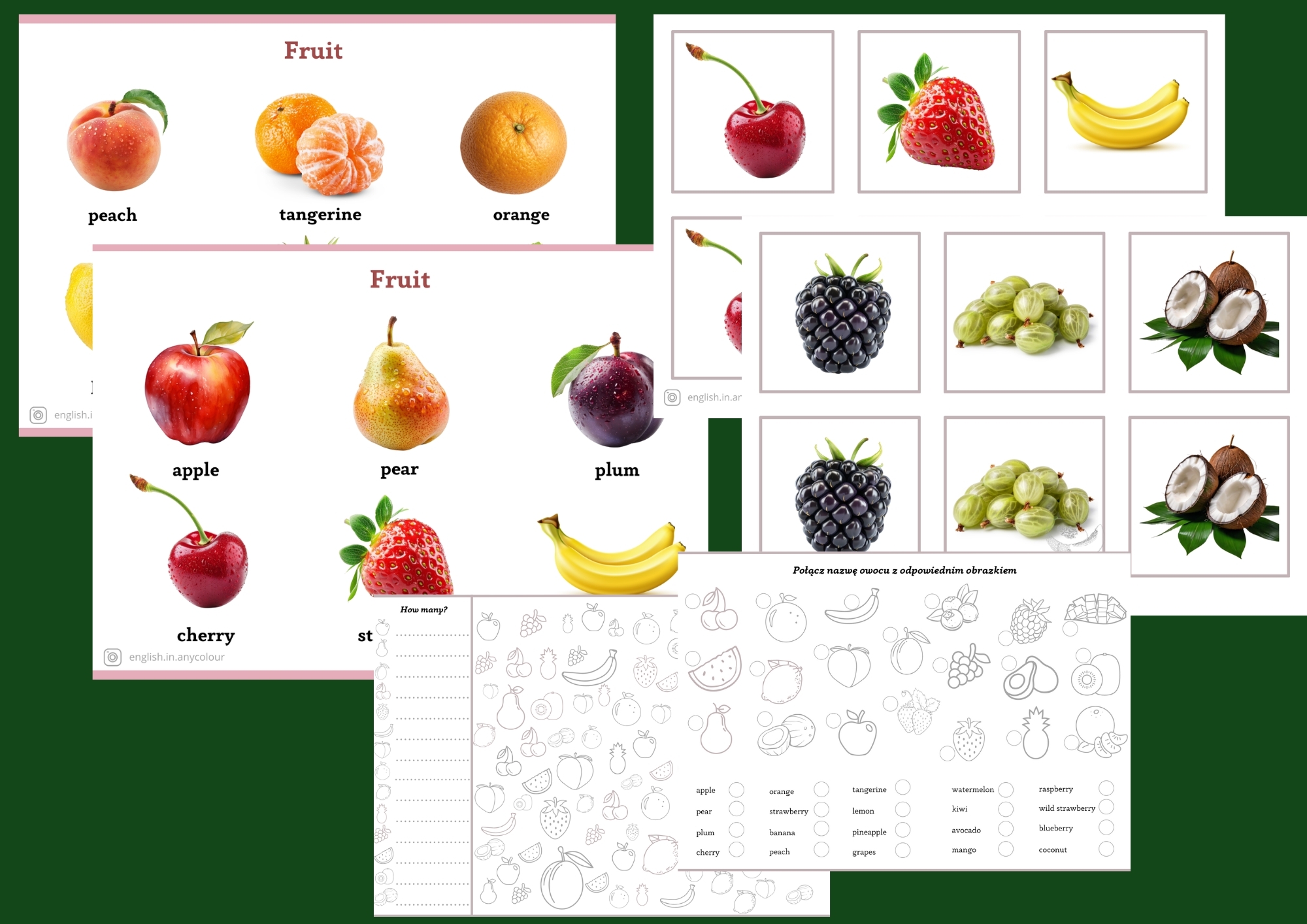 – 4 karty słownika obrazkowego – 6 owoców na jednej karcie