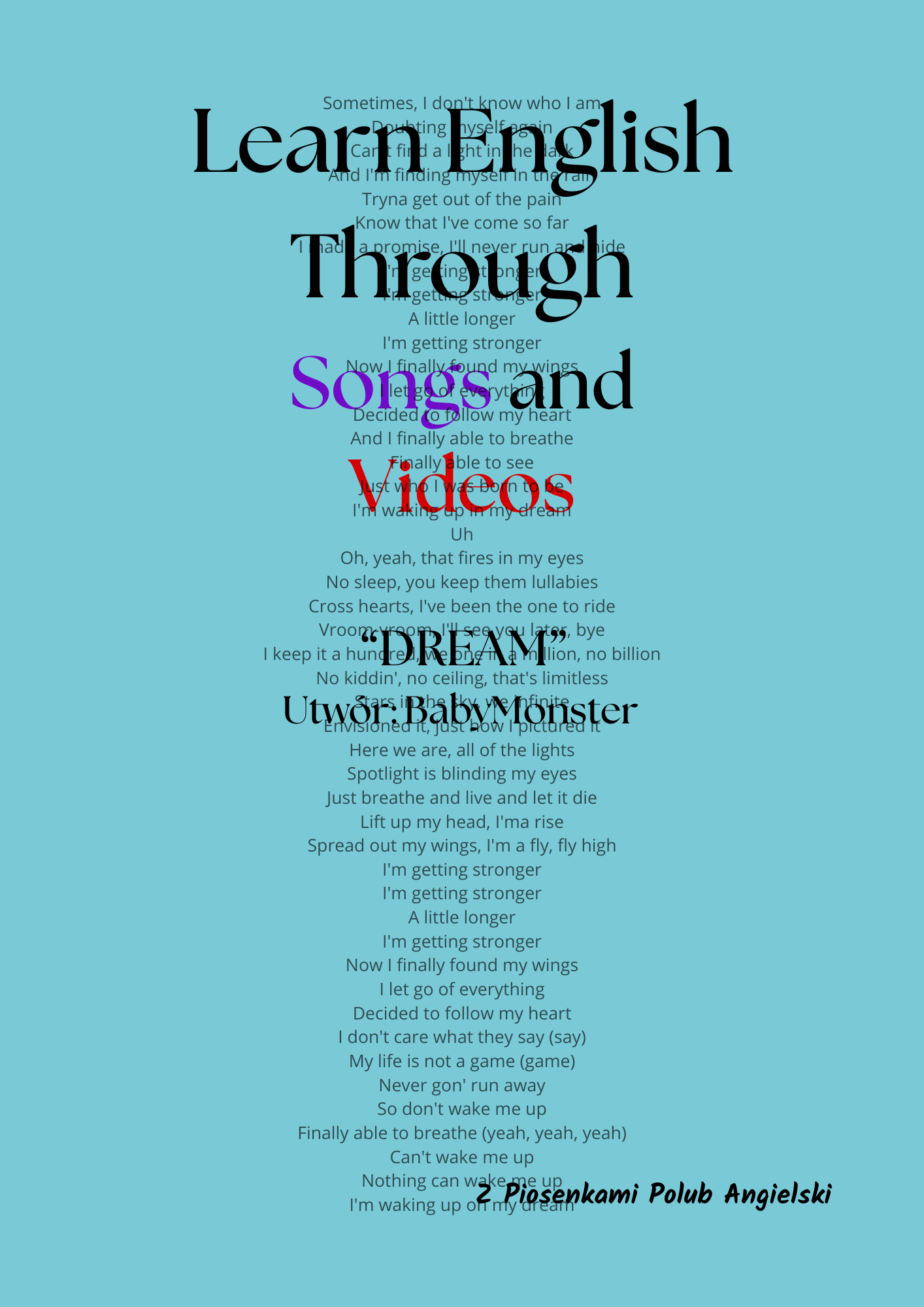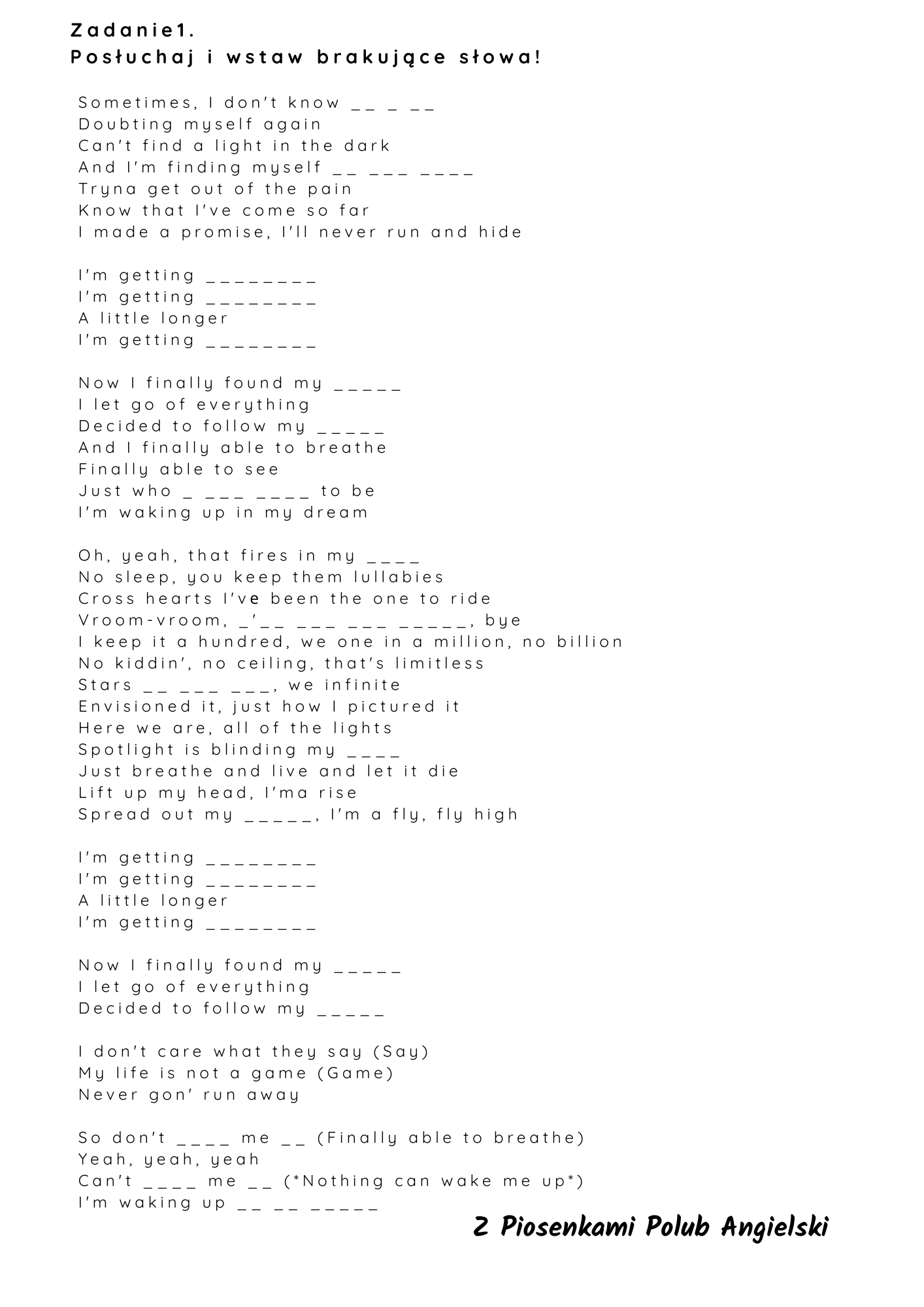 Plik zawiera 7 zadania. Dwa zadania polegają na wpisaniu w brakujące miejsca słów, zwrotów ze słuchu i z pomocą. Poza tym są zadania z tłumaczenia, wpisanie poprawnej formy gramatycznej ze stopniowania przymiotników na uzupełnianiu zdań. Wszystkie zadania skupiają się na poznaniu słownictwa z piosenki. Jest to nauka angielskiego z piosenką.