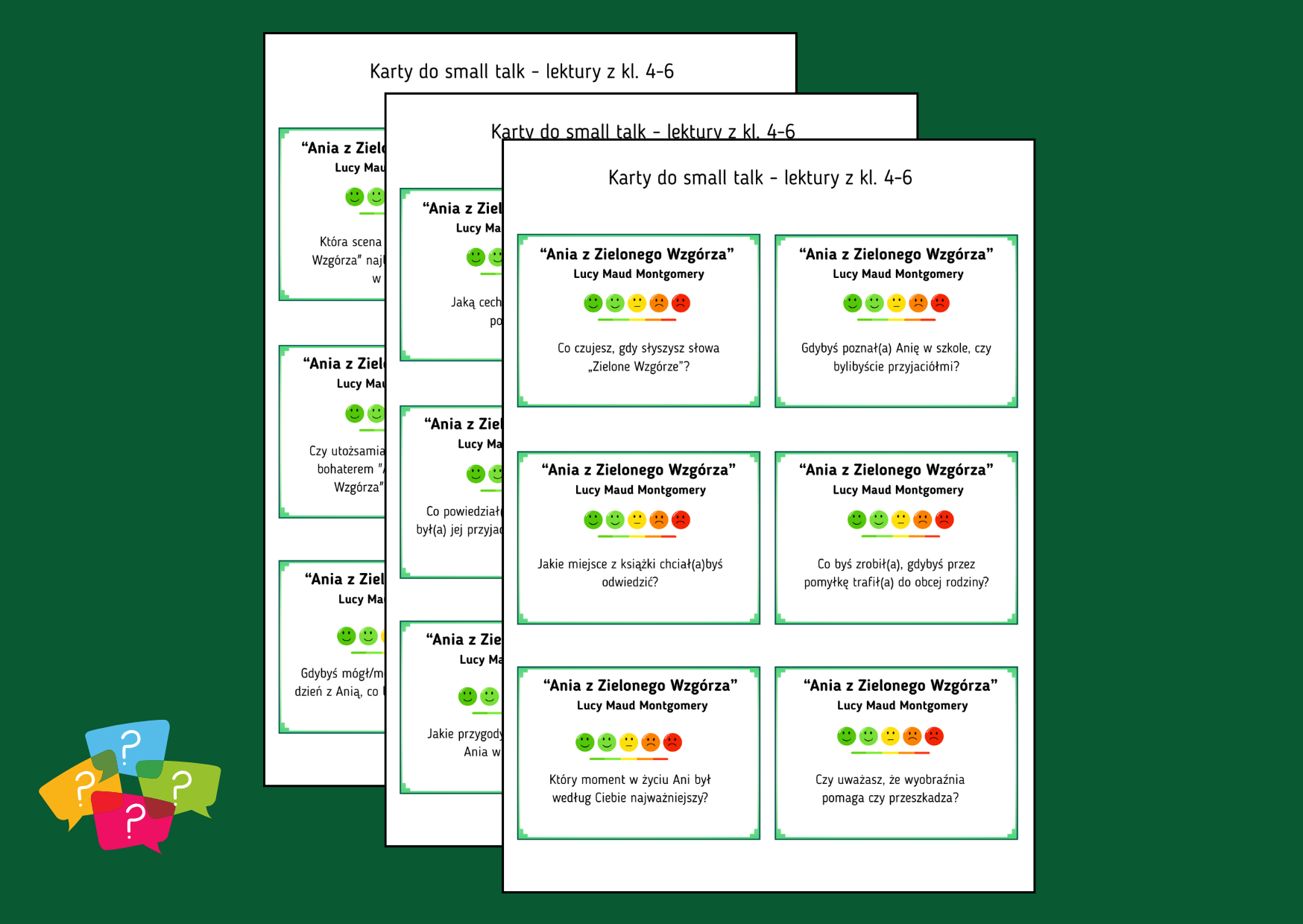18 pytań typu „Karty small talk” do "Ani z Zielonego Wzgórza." Takie pytania mają charakter swobodny, zachęcają do refleksji, rozmowy i dzielenia się opinią, a nie tylko sprawdzają wiedzę. Mogą być wykorzystywane na lekcjach jako forma integracji z lekturą lub podczas luźniejszych rozmów literackich. Dzięki nim można ćwiczyć wypowiedź argumentacyjną. Zasady: uczeń losuje kartę i odpowiada na pytanie (lub wszyscy uczniowie odpowiadają na to samo pytanie).