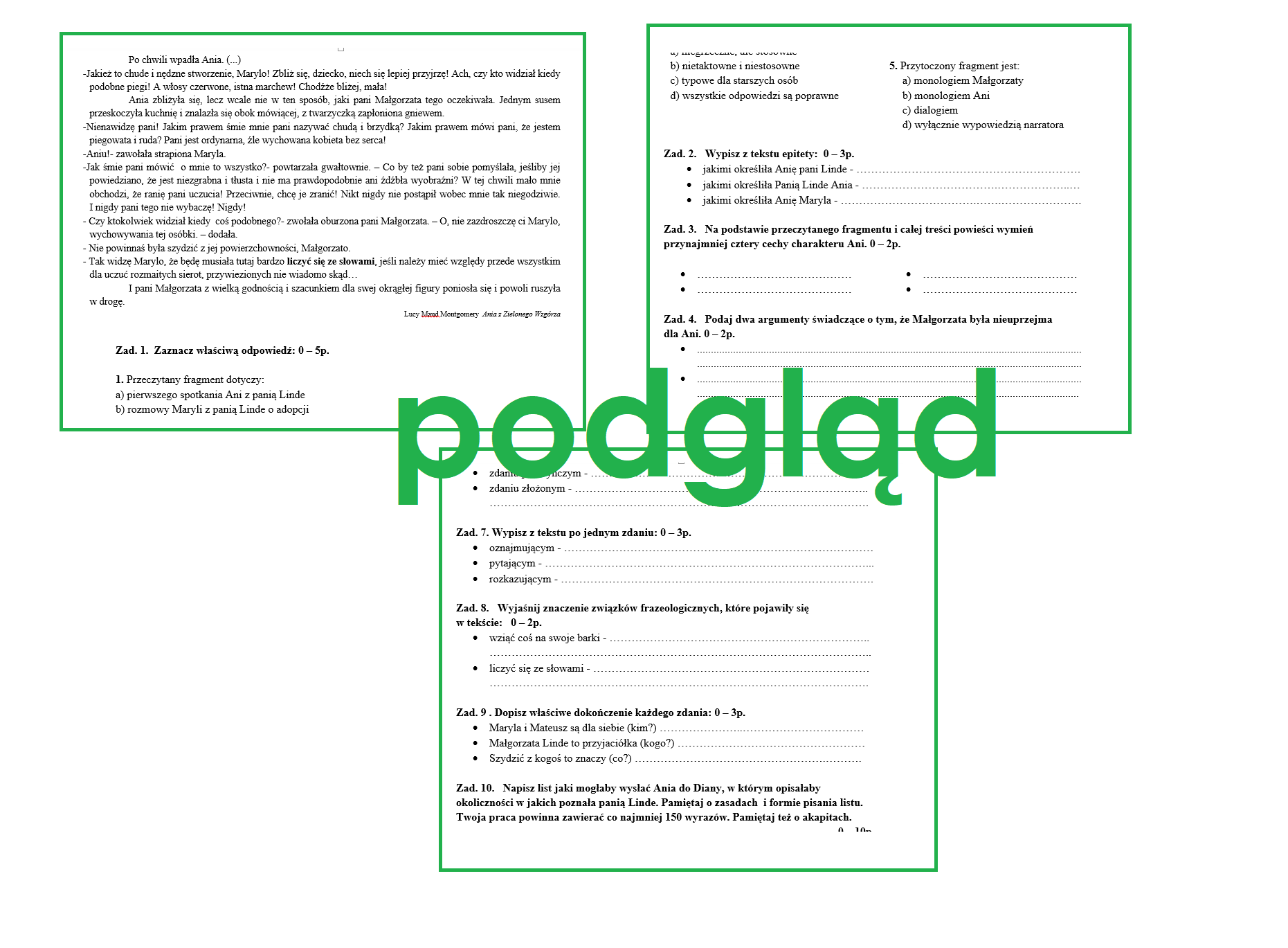 - tekstu źródłowego (fragment lektury) i pytań sprawdzających stopień zrozumienia,