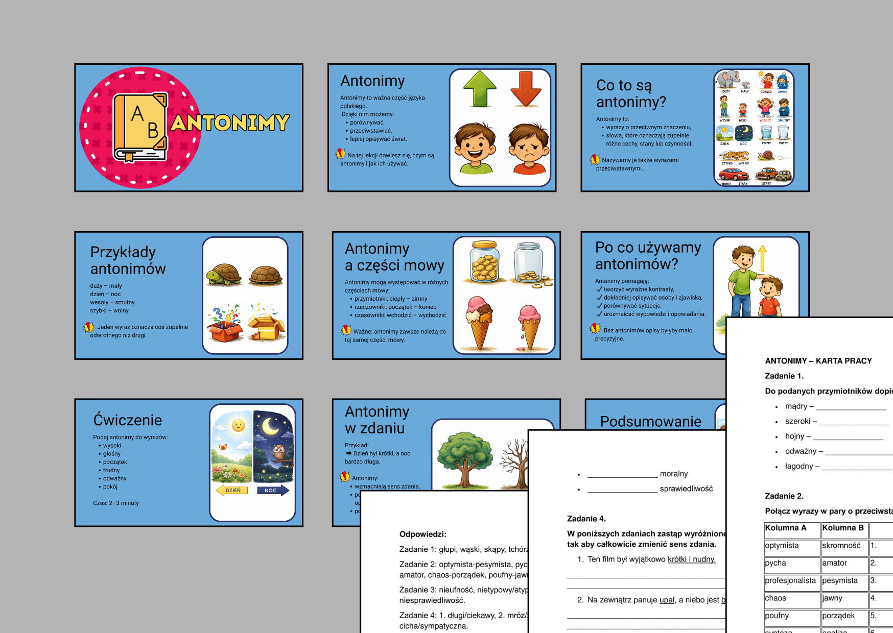 📘 ANTONIMY – prezentacja (11 slajdów) + karta pracy (2 strony) z odpowiedziami