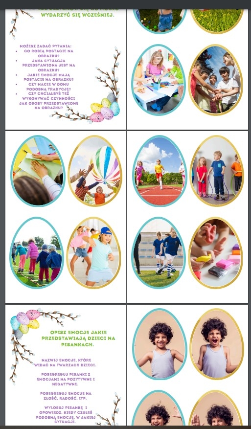 - OPISZ EMOCJE JAKIE PRZEDSTAWIAJĄ DZIECI NA PISANKACH. NAZWIJ EMOCJE, KTÓRE WIDAĆ NA TWARZACH DZIECI. POSEGREGUJ PISANKI Z