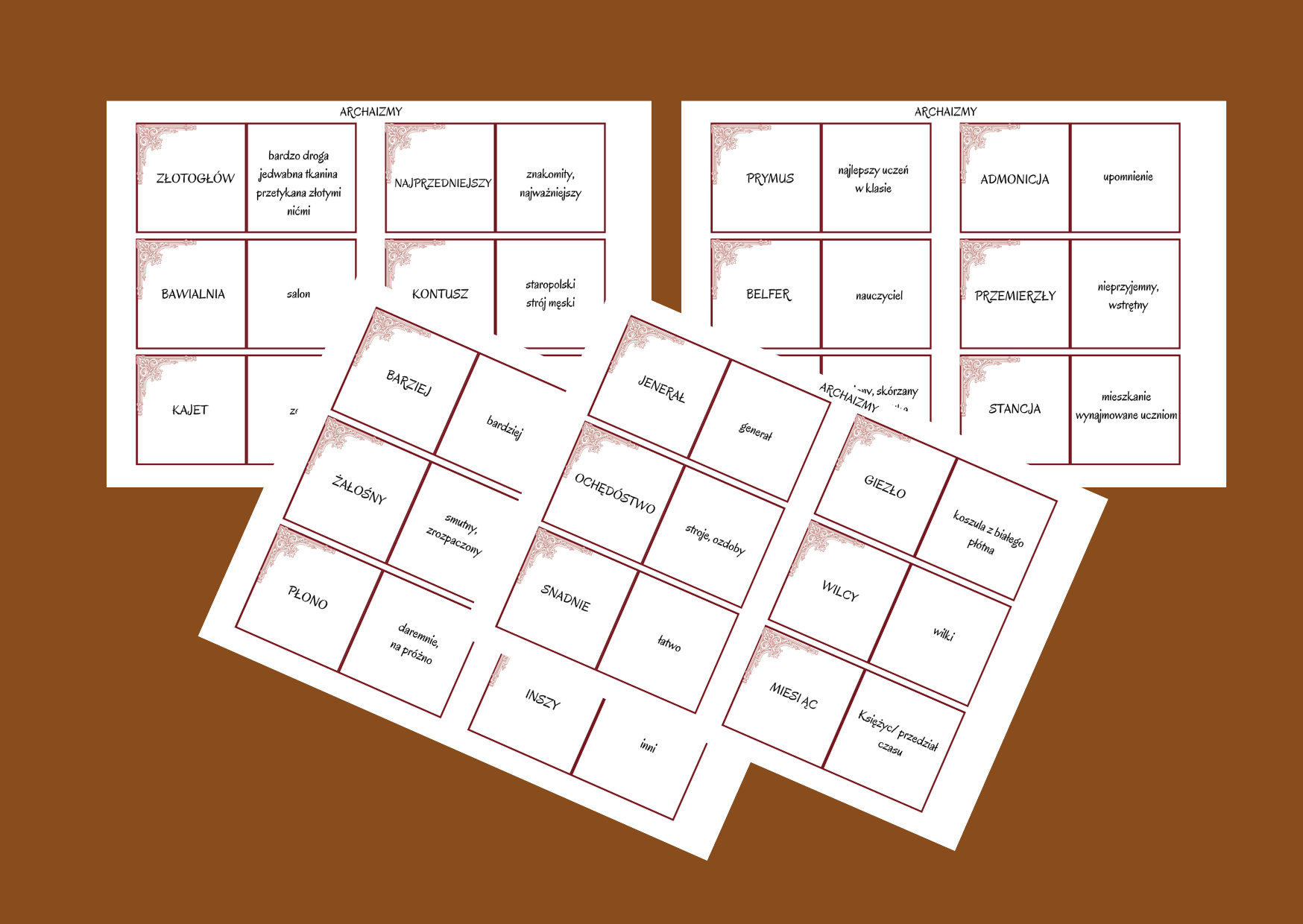 Materiał zawiera 12 stron fiszek z archaizmami. Po wycięciu można je zalaminować, by dłużej posłużyły. Zadaniem uczniów jest połączenie archaizmu z jego znaczeniem.