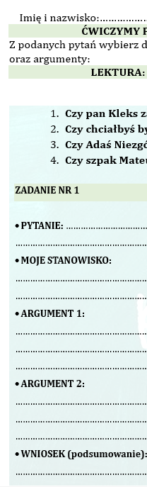 Każdy arkusz zawiera cztery pytania inspirowane poznaną lekturą, szablon pomagający uczniowi w przeprowadzeniu argumentacji, garść podpowiedzi oraz kryteria sukcesu. Zachęcam do pracy z materiałem podczas lekcji przy jednoczesnym stosowaniu oceny koleżeńskiej, samooceny oraz oceny opisowej.