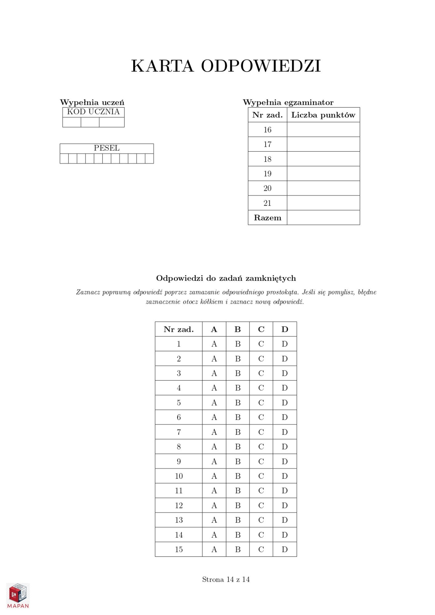 Profesjonalny Skład: Wygląd identyczny jak na prawdziwym egzaminie państwowym (strona tytułowa, kodowanie, karta odpowiedzi) – oswaja ucznia z formą arkusza.
