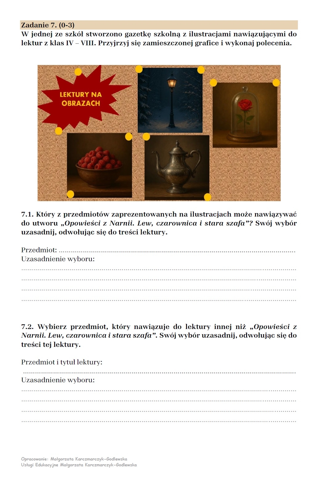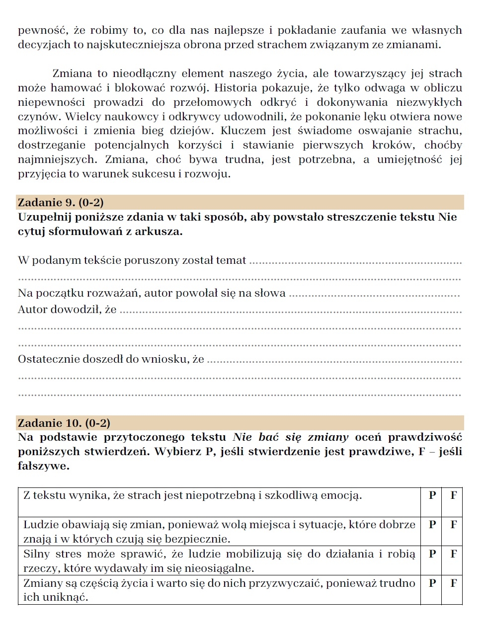 Arkusz zbudowanych zgodnie ze schematem CKE: fragment tekstu literackiego + pytania, tekst nieliteracki + czytanie ze zrozumieniem, forma pisemna.