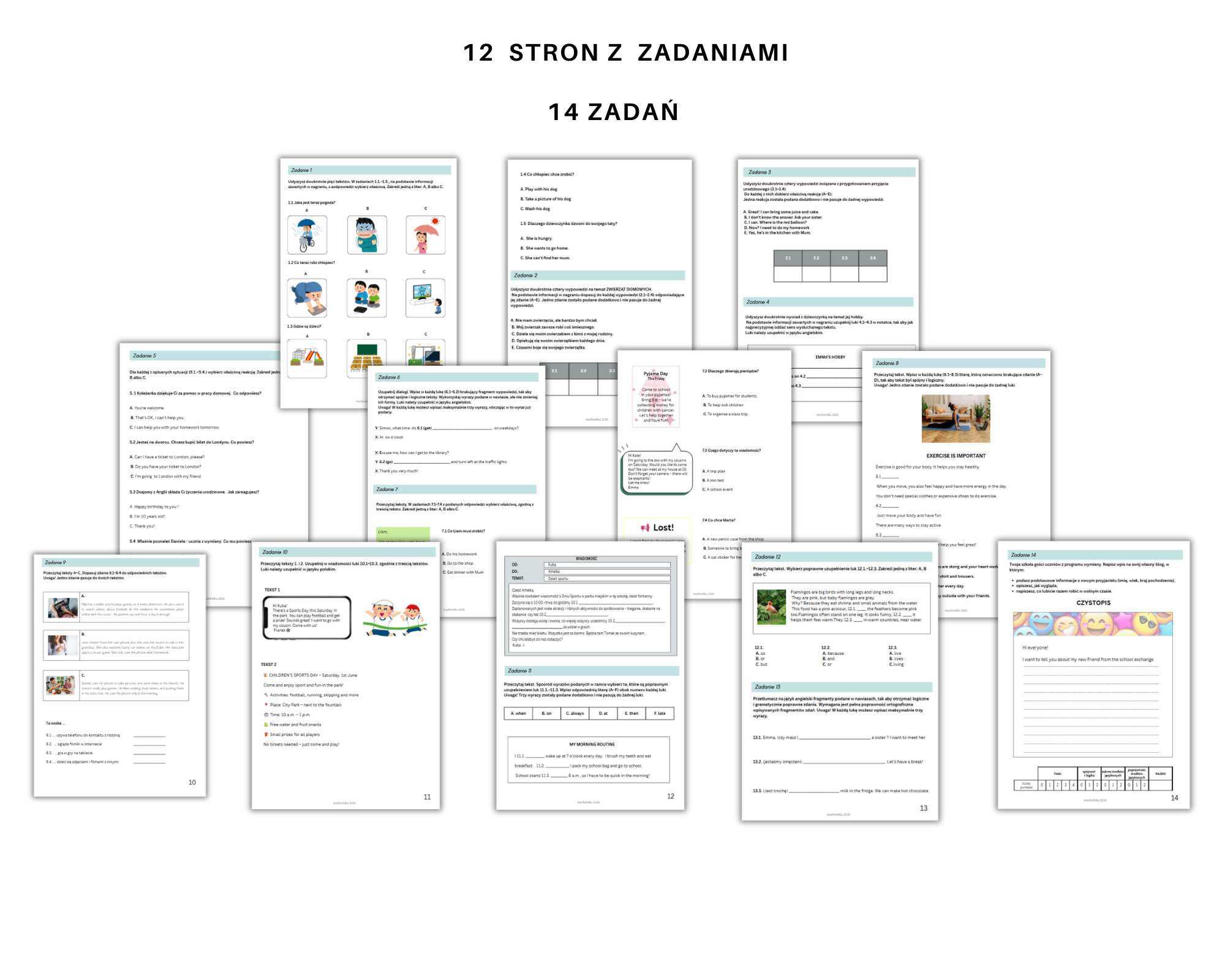 Egzamin 4-klasisty – kompletny arkusz egzaminacyjny z języka angielskiego, przygotowany specjalnie dla uczniów po 4. klasie szkoły podstawowej. Łączy on strukturę prawdziwego egzaminu ósmoklasisty z zakresem materiału, który dziecko faktycznie opanowało w szkole. Co znajduje się w środku zestawu: Arkusz egzaminacyjny – ze stroną tytułową, instrukcją, 14 zadaniami na wzór egzaminu ósmoklasisty, kartą odpowiedzi oraz brudnopisem. Odpowiedzi do zadań zamkniętych, jak i otwartych (poza zadaniem pisemnym). Transkrypcja nagrań. Nagrania do zadań słuchowych. Zakres materiału, na podstawie którego powstał egzamin, dotyczy treści realizowanych w programie klasy 4. Są to między innymi: Czas Present Simple, odmiana czasownika have got, to be oraz konstrukcja there is/there are. Tematyka obejmuje: zwierzęta, zainteresowania, sposoby spędzania wolnego czasu, wygląd, sport oraz proste sytuacje codzienne, takie jak dziękowanie, składanie życzeń czy kupowanie biletu. Uwagi: Zadania zostały opracowane na podstawie całego materiału realizowanego w klasie 4. Jeśli uczniowie nie wykraczają poza materiał szkolny, zaleca się przeprowadzenie egzaminu pod koniec klasy 4. bądź na początku klasy 5. Jego głównym celem jest zapoznanie uczniów z typem zadań egzaminacyjnych przy zachowaniu odpowiedniego poziomu trudności. Egzamin wraz z nagraniami zostały spakowane w plik ZIP Nagrania do zadań zostały stworzone z pomocą sztucznej inteligencji. Ich jakość można ocenić, wchodząc pod ten link: https://www.youtube.com/watch?v=bbplRl9qscY