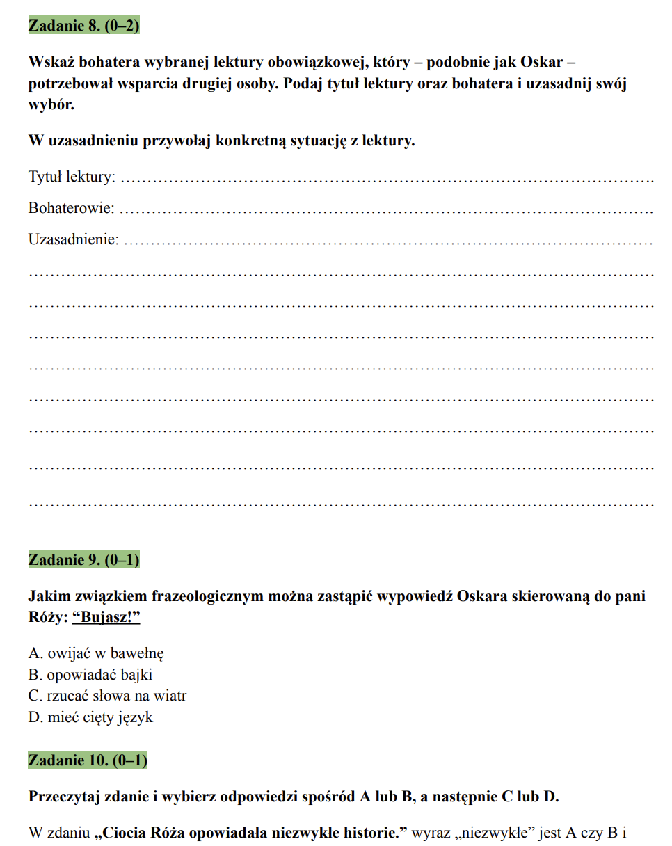 Arkusz egzaminacyjny – z frag. „Oskara i pani Róży” (klasa 8)