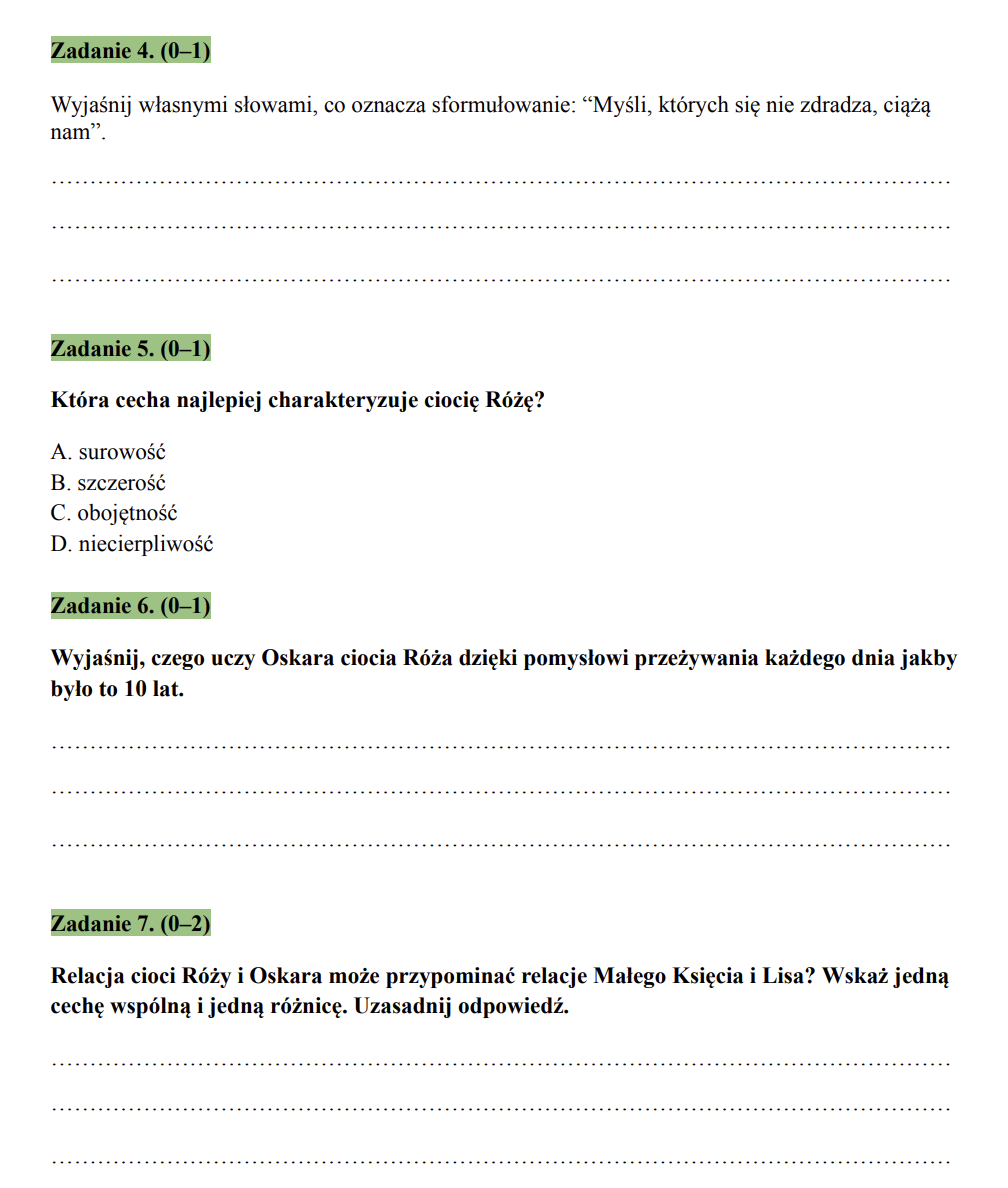 Przykładowy arkusz egzaminacyjny przygotowany na podstawie fragmentu lektury „Oskar i pani Róża”, który doskonale sprawdzi się jako materiał ćwiczeniowy przed egzaminem ósmoklasisty.