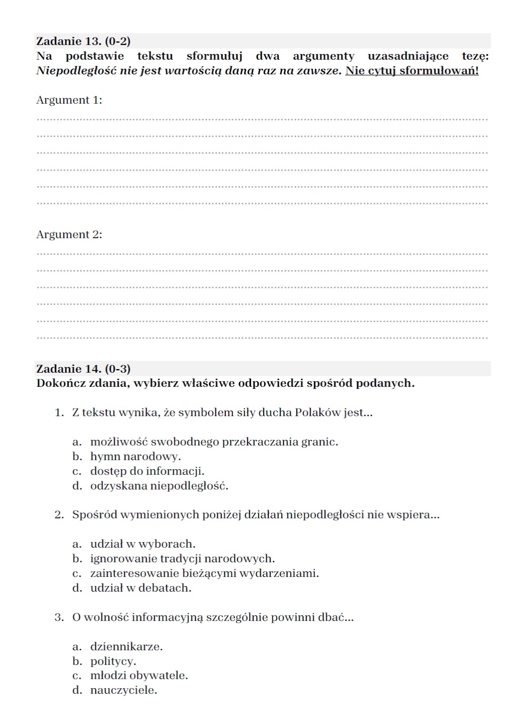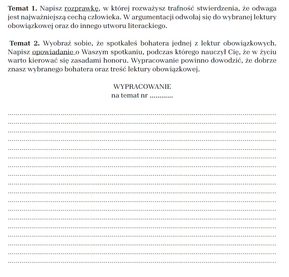 12 tematów prac pisemnych (6 wypowiedzi argumentacyjnych + 6 opowiadań) z liniaturą i miejscem na punktację,
