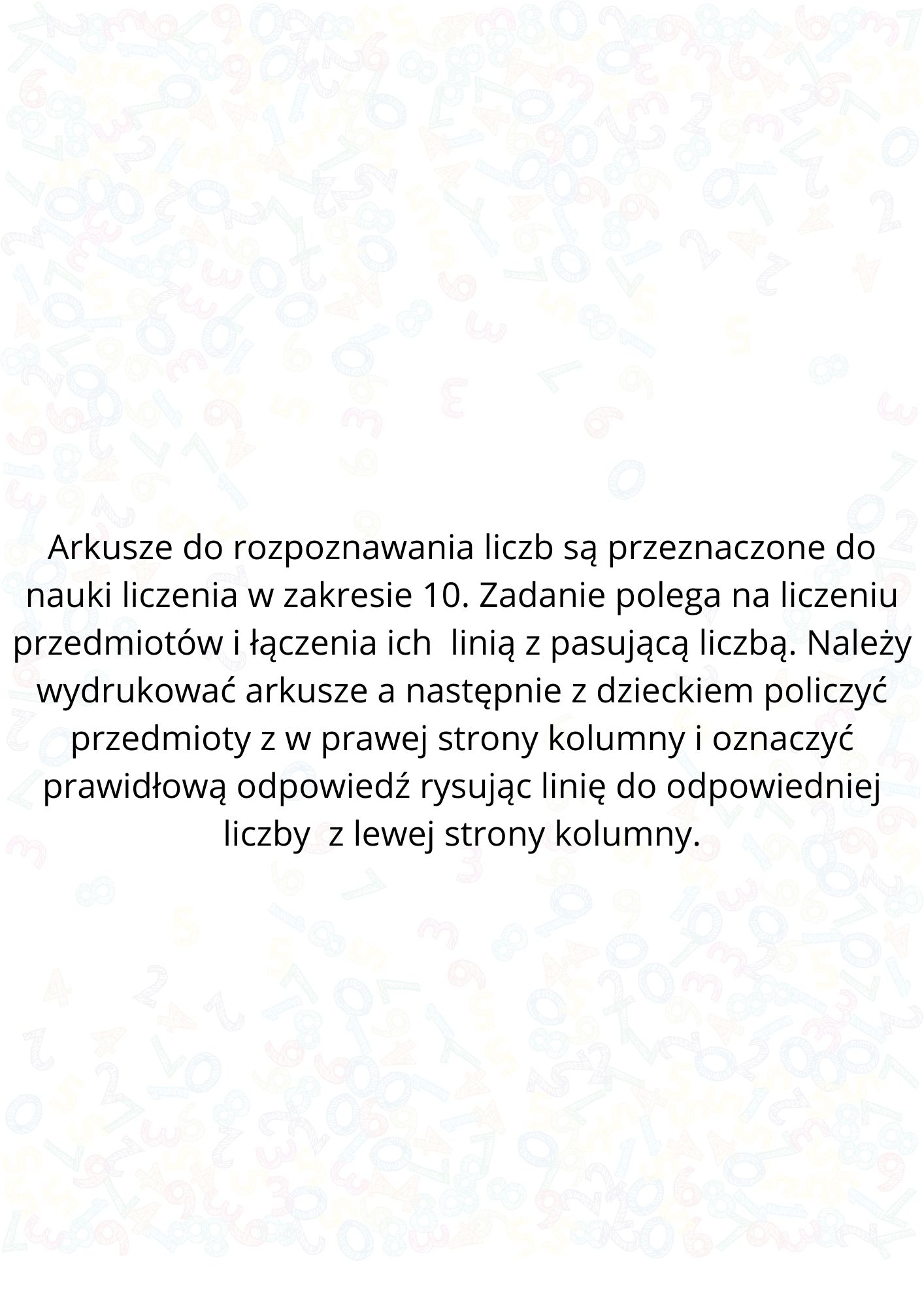 Arkusze do rozpoznawania liczb są przeznaczone do nauki liczenia w zakresie 10. Zadanie polega na liczeniu przedmiotów i łączenia ich linią z pasującą liczbą. Należy wydrukować arkusze a następnie