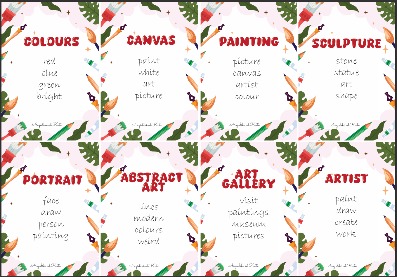 zawiera 64 karty do ćwiczenia mówienia na lekcji języka angielkiego w miły i zabawny sposób o tematyce sztuki, literatury i dziennikarstwa. Zawiera również tło. Zagadnienia od A1- B2.