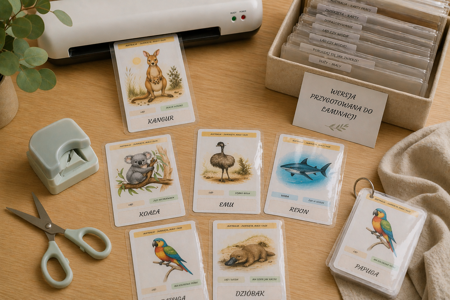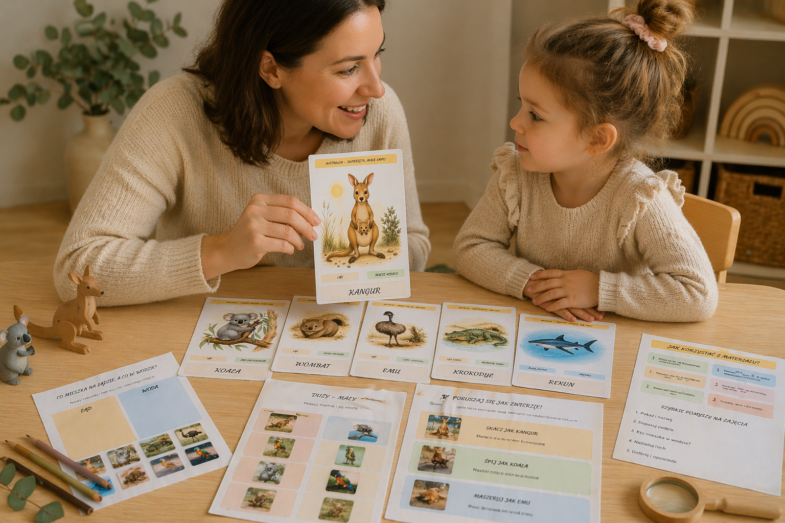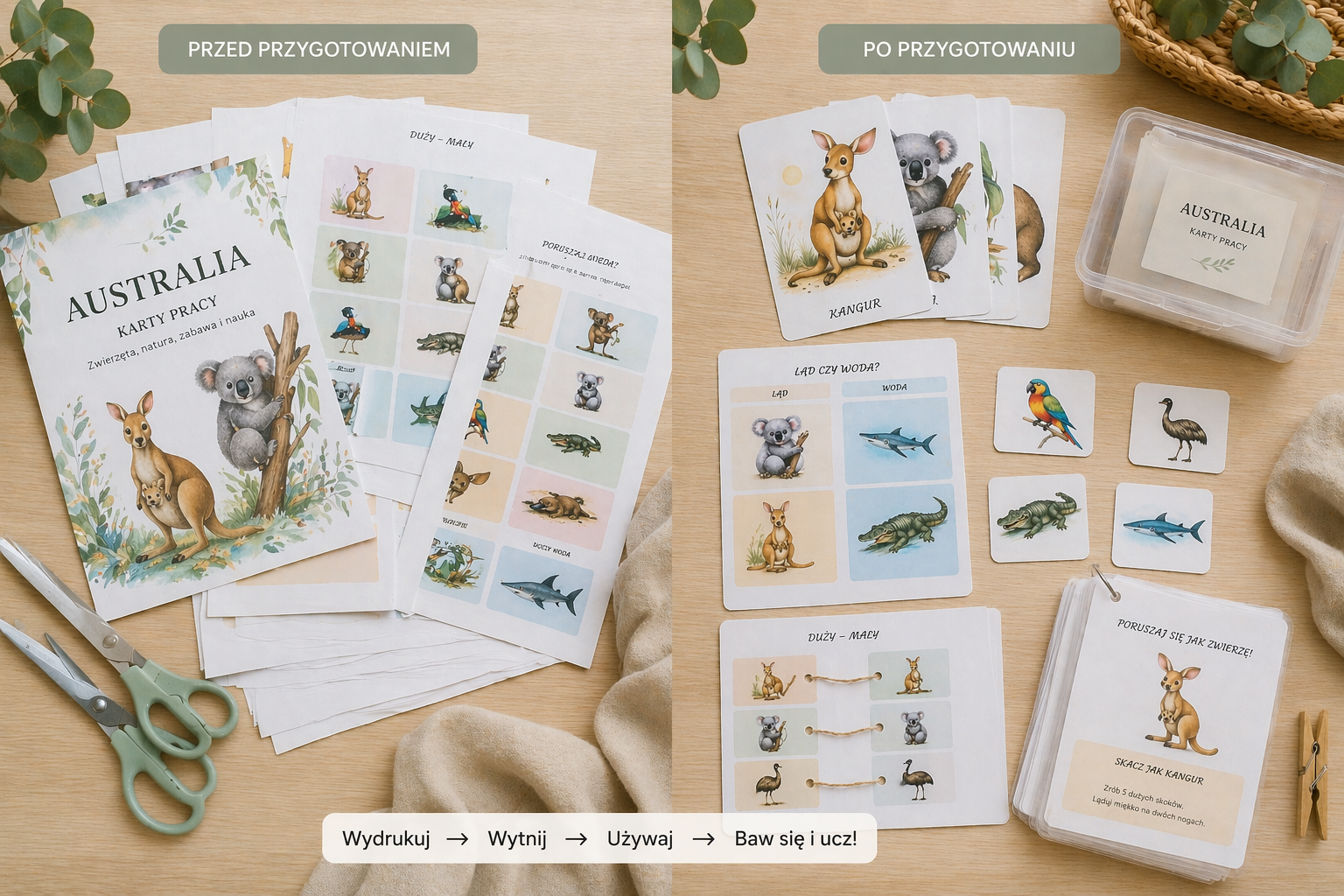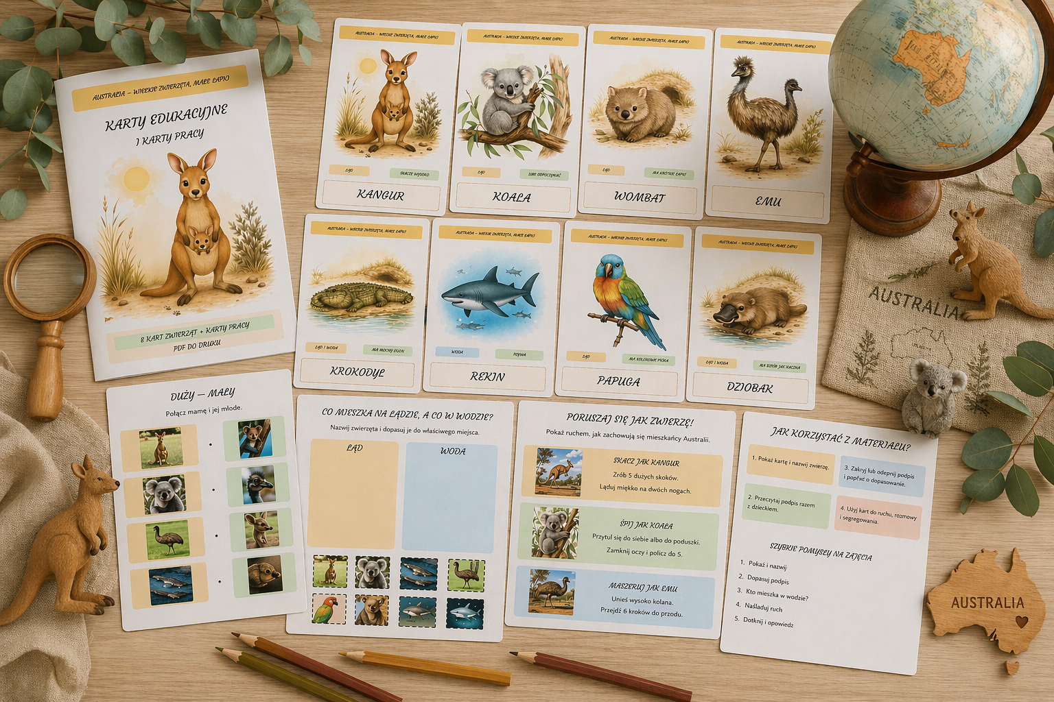 Zestaw pięknych, ilustracyjnych kart edukacyjnych, które zabierają dzieci w niezwykłą podróż do świata australijskich zwierząt! 🦘🌿