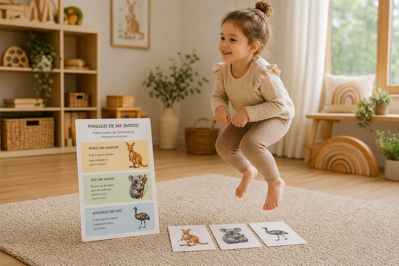 ✔️ zabawy ruchowe (np. skacz jak kangur 🦘, śpij jak koala 😴)