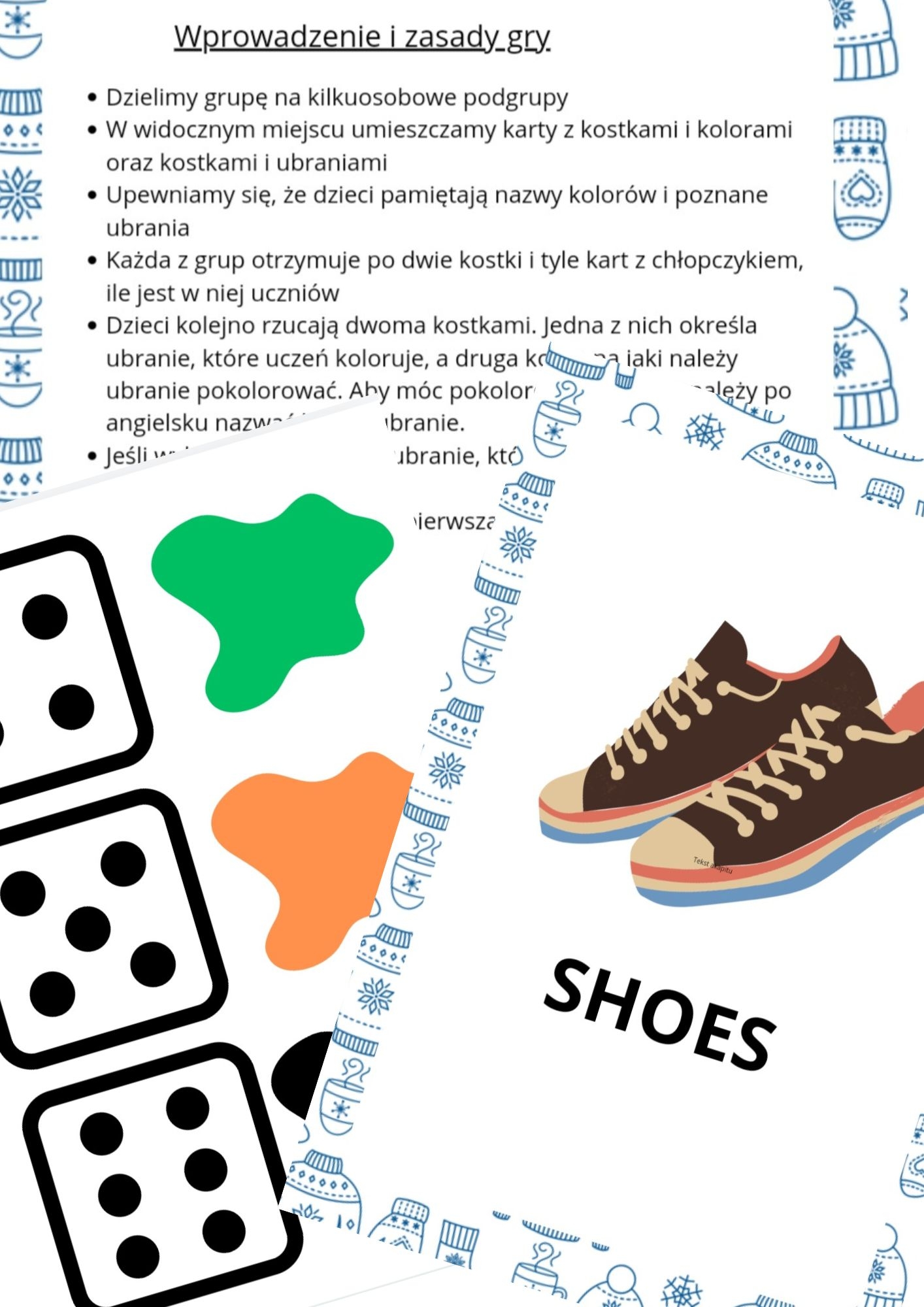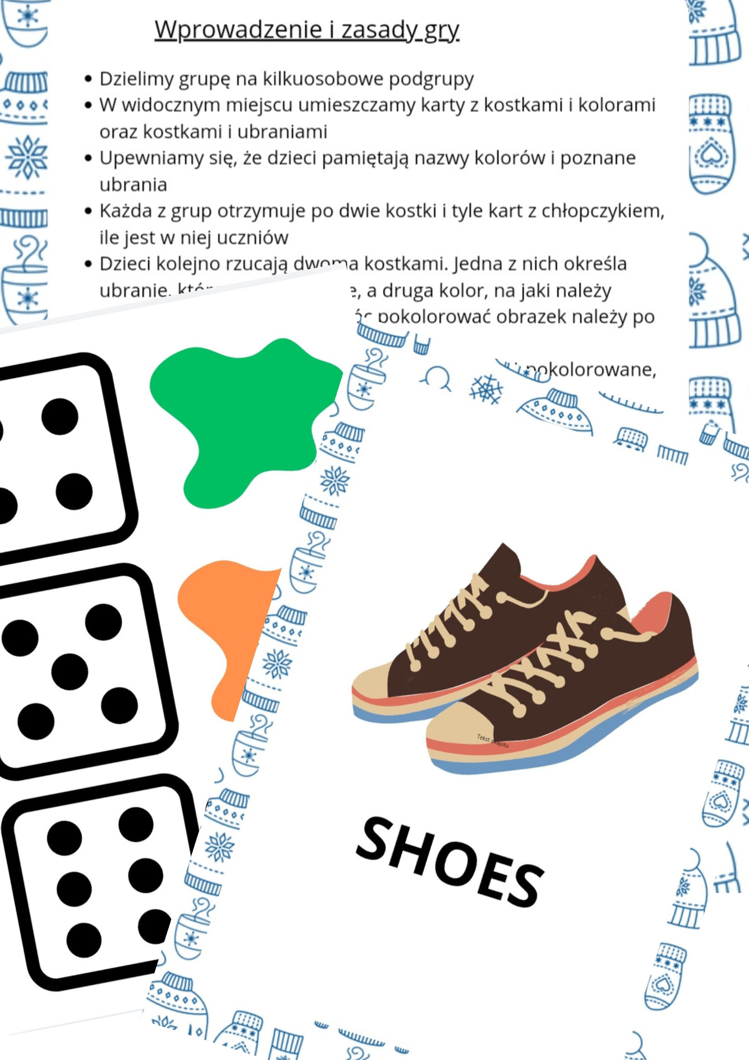 Karty obrazkowe do demonstracji słownictwa - jesienne ubrania wraz z grą stolikową z wykorzystaniem dołączonych kart pracy, kostek oraz kredek.