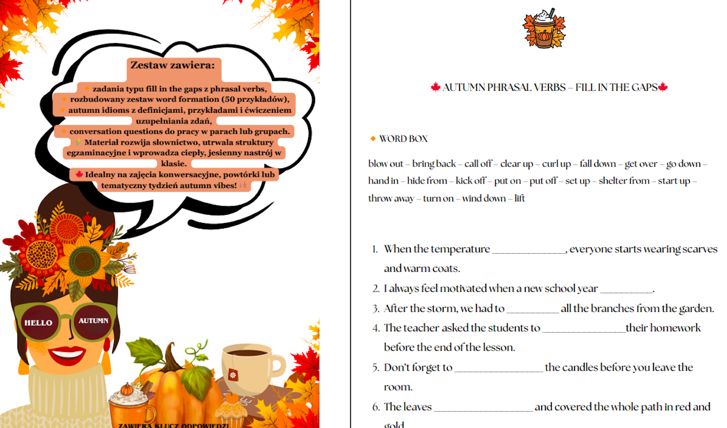Zestaw pełen praktycznych ćwiczeń leksykalno-gramatycznych inspirowanych jesienią – idealny dla uczniów na poziomie B1–B2 oraz maturzystów przygotowujących się do poziomu rozszerzonego.