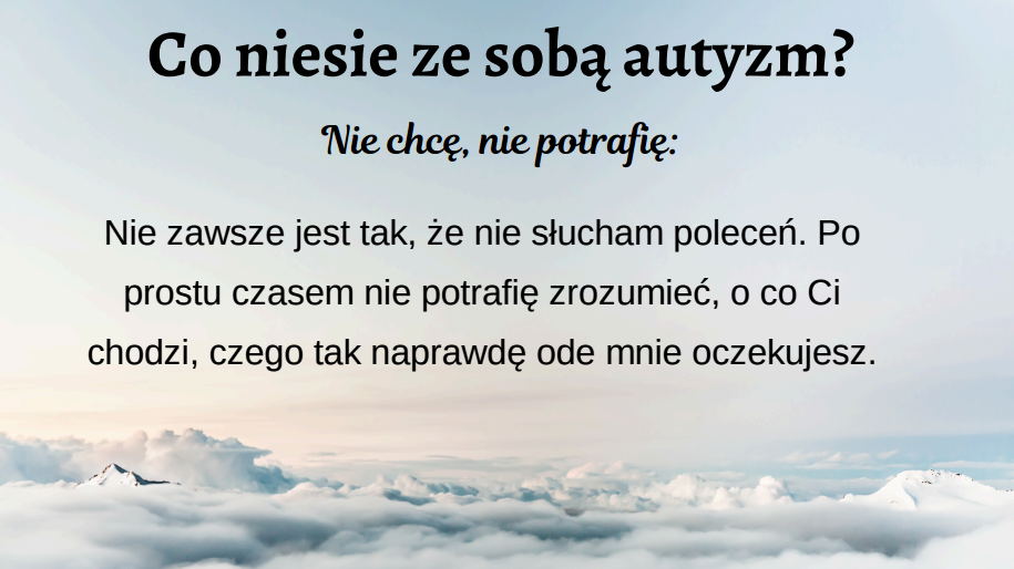 Całość opiera się na cytatach i refleksjach z uznanych publikacji, takich jak „10 rzeczy, o których chciałoby Ci powiedzieć dziecko z autyzmem” Ellen Notbohm czy „Autyzm od wewnątrz” Hilde De Clercq, dzięki czemu materiał łączy naukowe podstawy z praktycznym doświadczeniem.