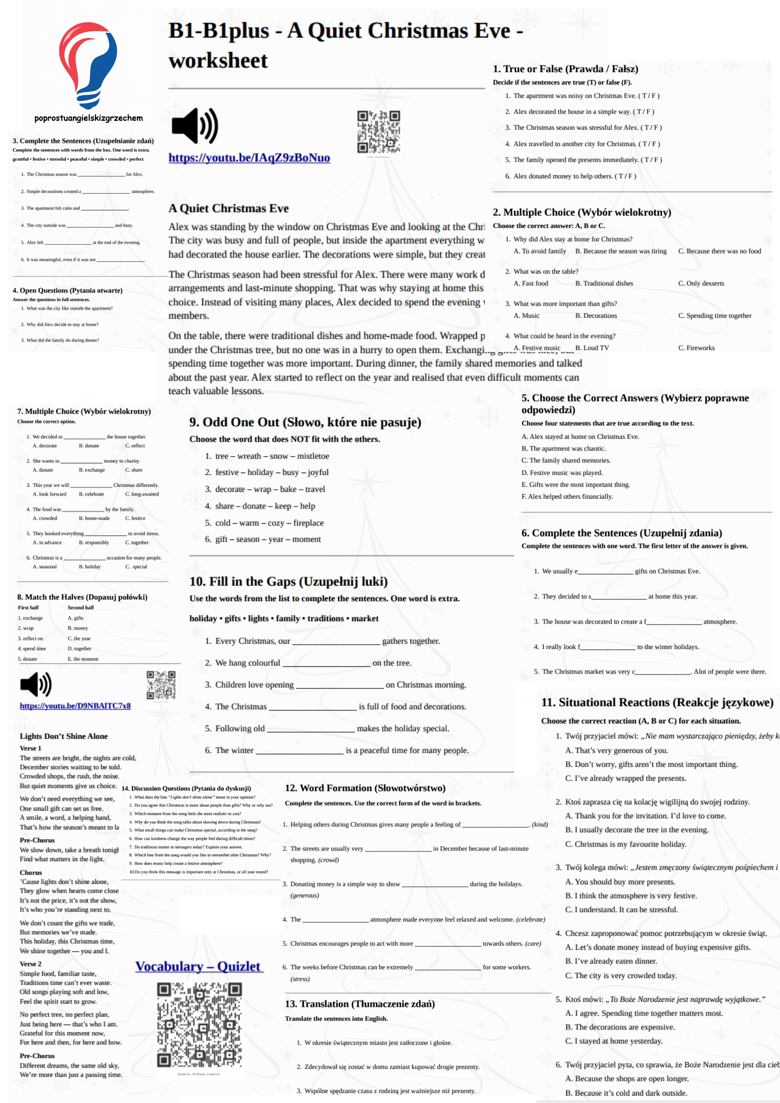 Masz grudzień, uczniów, lekcję… i zero czasu na tworzenie materiałów? Znam ten ból. Dlatego zrobiłem to za Ciebie 😄 To gotowa, linijka karta pracy dla uczniów B1–B1+, oparta na 50 świątecznych słówkach i zwrotach, która ogarnia całą lekcję (a nawet dwie) bez kombinowania. Co dostajesz w pakiecie? 👇 📄 15 różnorodnych zadań – od True/False i Multiple Choice po Speaking, Writing i Translation 🎧 Listening – opowiadanie + transkrypcja 🎵 Świąteczna piosenka 🧩 4 krzyżówki ze świątecznym słownictwem 🖼️ Obrazki do opisu („In this picture I can see…”) 📊 Lista słówek w Excelu 📱 Link do Quizleta + kody QR – uczniowie ćwiczą też poza lekcją 🔑 Klucz odpowiedzi – bo Twój czas jest święty Formaty? Wszystko, co lubimy: ✔ PDF ✔ mp3 ✔ linki do YouTube ✔ materiały gotowe do użycia od razu 🎁 Efekt? – mniej przygotowań – więcej mówienia na lekcji – zadowoleni uczniowie – spokojna głowa nauczyciela
