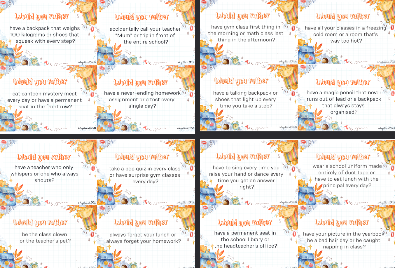Back to school Would you rather? to zestaw 48 zabawnych pytań ćwiczacych mówienie na zajęciach z języka angielskiego.