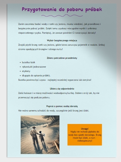 Materiał „Badanie wody: krok po kroku” to wyjątkowe kompendium wiedzy, które w przejrzysty i atrakcyjny sposób prowadzi przez najważniejsze zagadnienia związane z kontrolą i ochroną wód. Stworzony z myślą o dzieciach, uczniach, rodzicach i nauczycielach, pokazuje dlaczego warto badać wodę, jak pobrać próbki, zmierzyć pH i wykryć różne związki chemiczne.