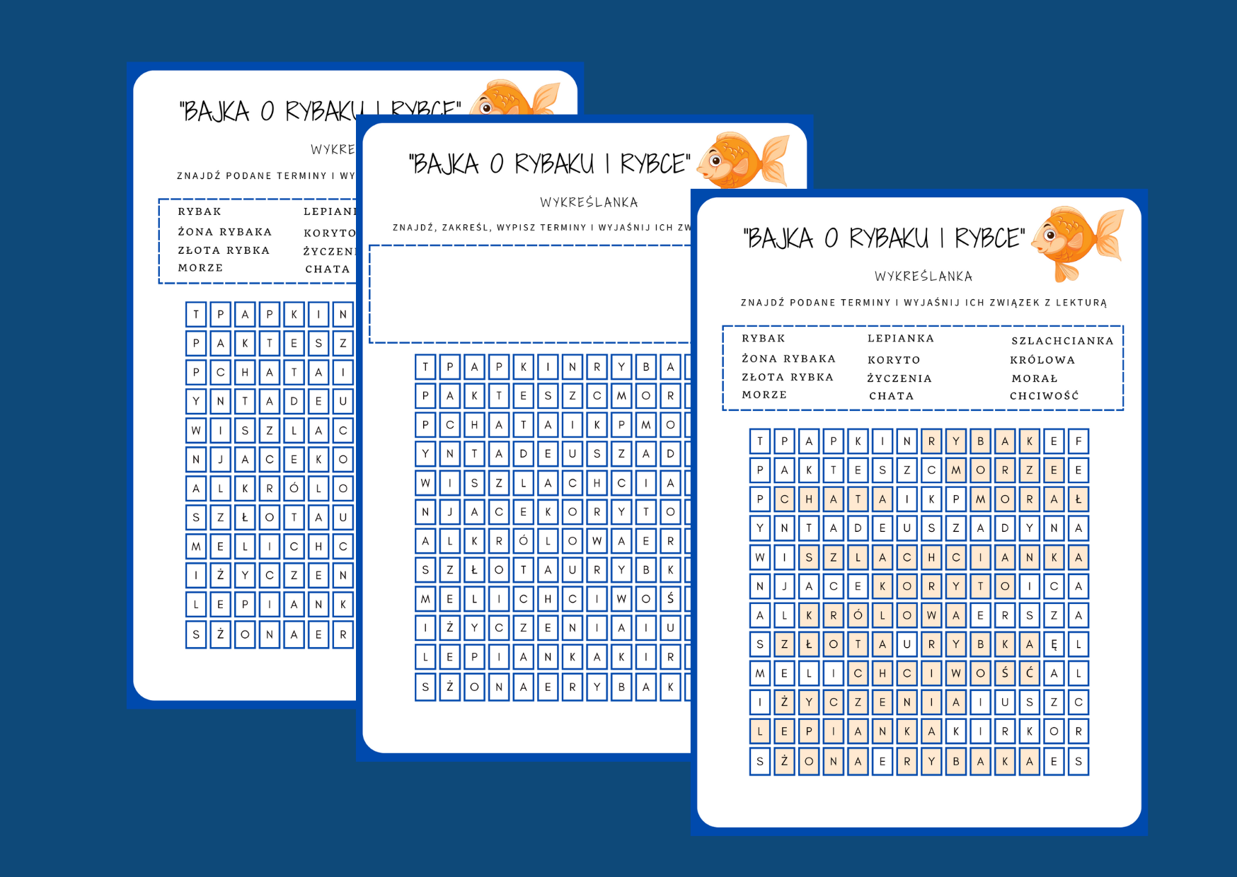 Materiał zawiera wykreślankę dotyczącą "Bajki o rybaku i rybce" A. Puszkina (3 wersje: z odpowiedziami, bez odpowiedzi, bez wyrazów do odnalezienia).