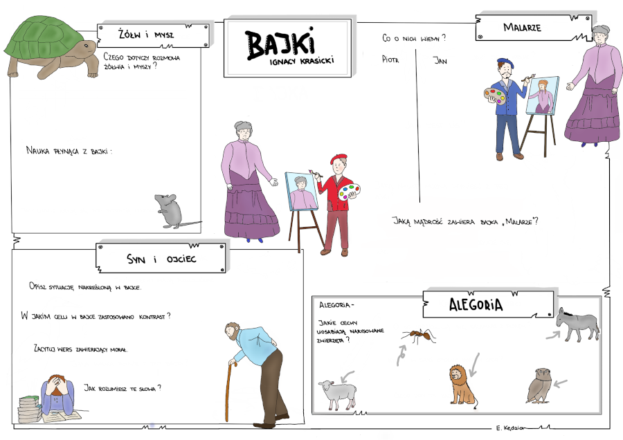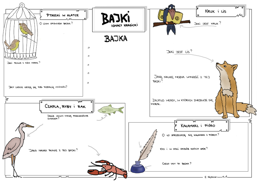 W zestawie znajdują się TRZY karty ułatwiające omówienie bajek Krasickiego: "Kałamarz i pióro", "Syn i ojciec", "Czapla, ryby i rak", "Ptaszki w klatce", "Malarze", "Żółw i mysz". Trzecia karta pozwala porównać bajkę "Przyjaciele" Krasickiego z bajką "Przyjaciele" Mickiewicza. Każda karta występuje w trzech wersjach: pustej czarno-białej, pustej kolorowej i kolorowej wstępnie wypełnionej.