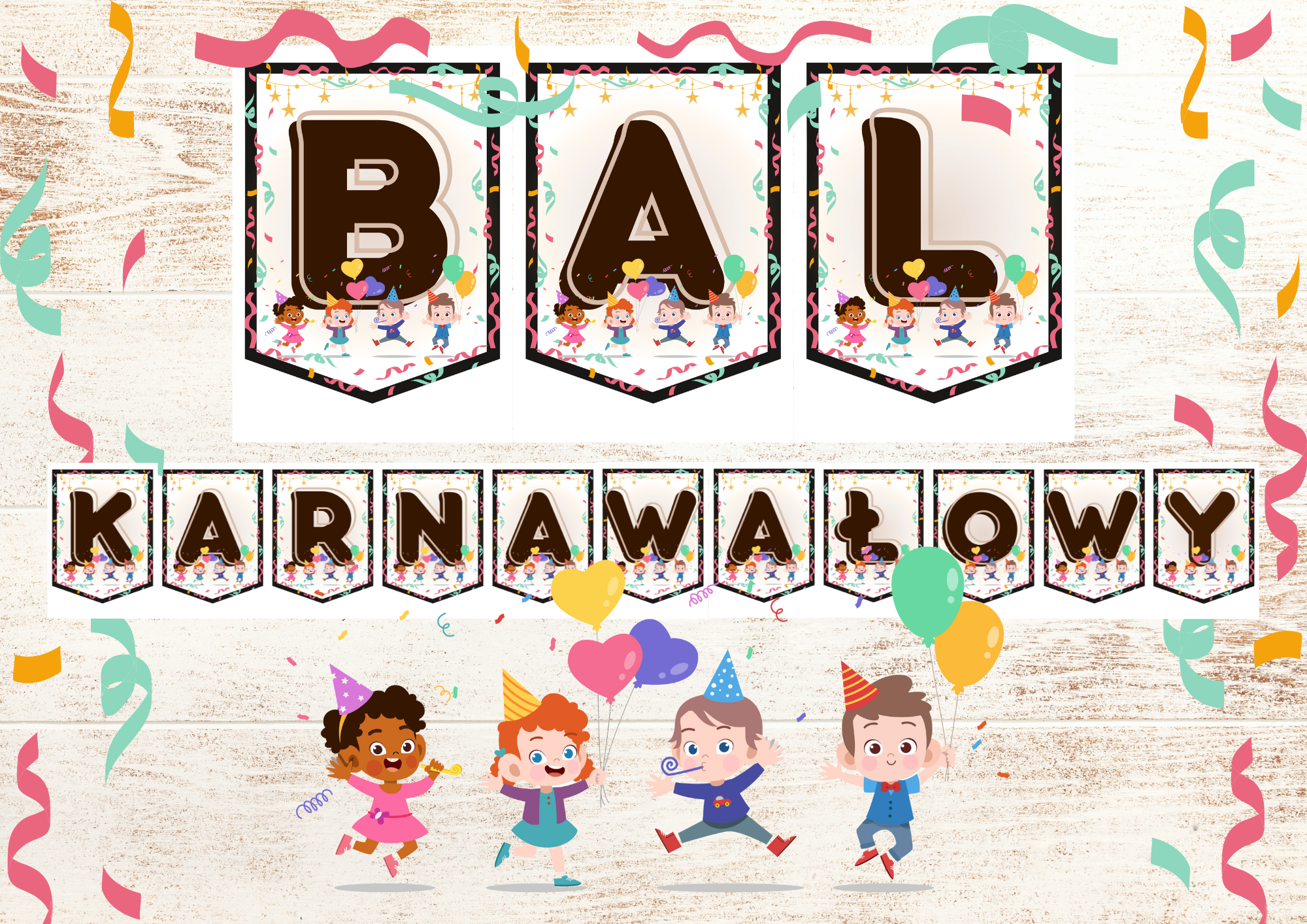 Napis/Girladna - każda litera w wersji A4 w wersji karnawałowej z czwórką dzieci z balonami.