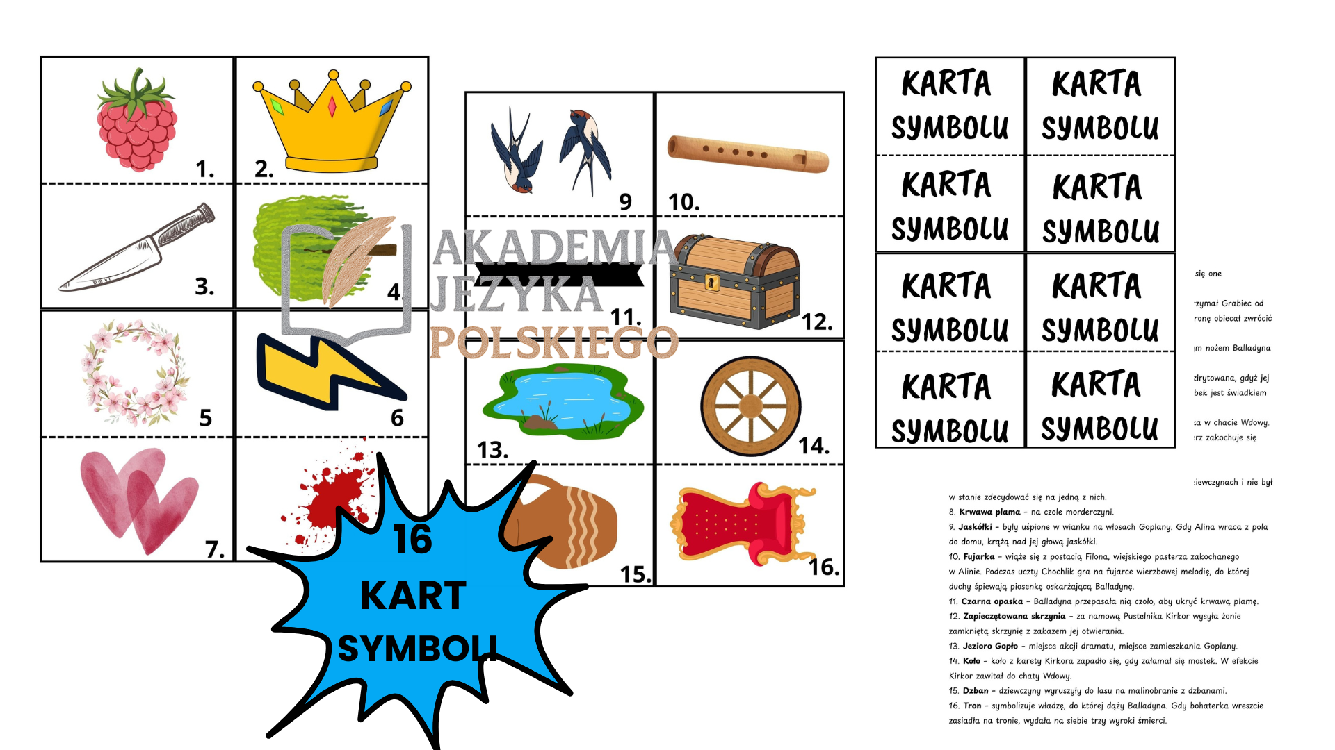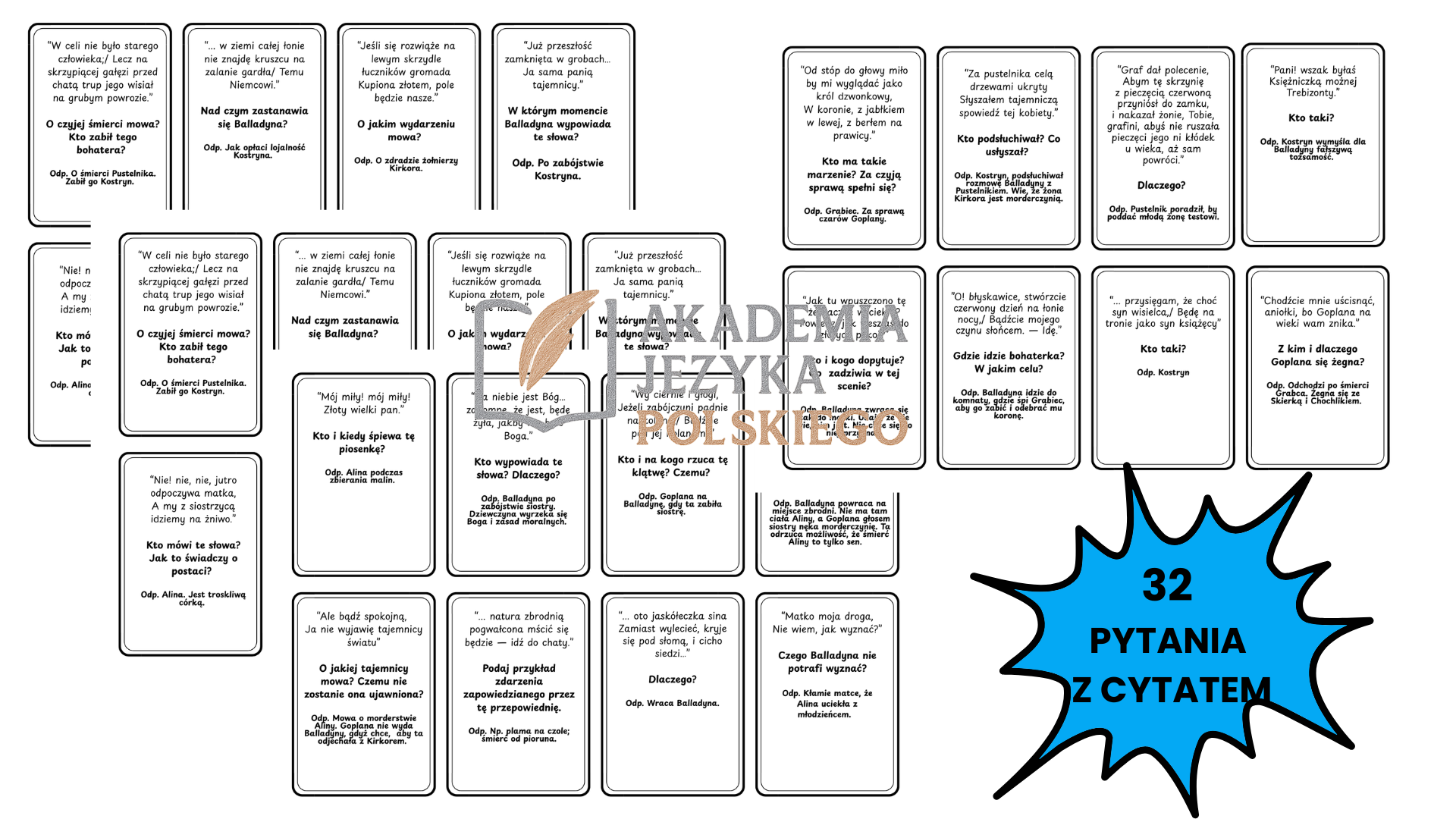 Autorska gra planszowa przeznaczona do pracy z lekturą „Balladyna”. Umożliwia aktywne utrwalanie treści utworu oraz skuteczną powtórkę materiału, szczególnie przed egzaminem ósmoklasisty.