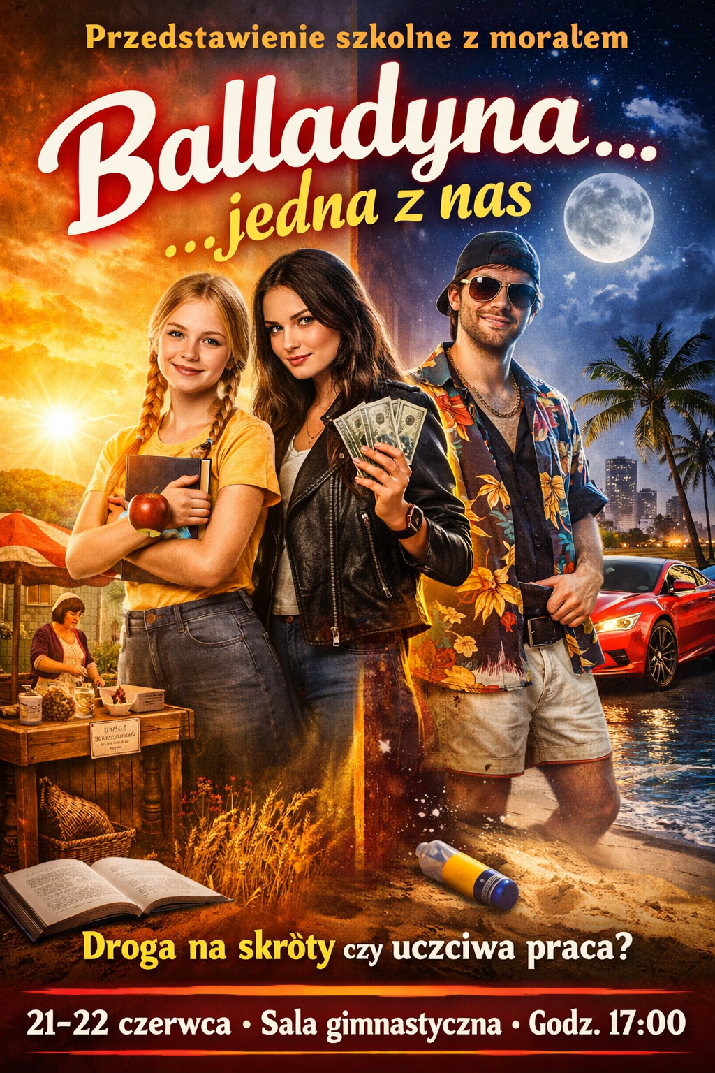 „Balladyna… jedna z nas” to współczesne przedstawienie szkolne inspirowane klasycznym motywem rywalizacji sióstr, przeniesione w realia dzisiejszego świata. Akcja rozgrywa się w małym miasteczku i pokazuje codzienne życie matki oraz jej dwóch córek – ambitnej, sprytnej Balladyny i uczciwej, pracowitej Aliny. Marzenia o lepszym życiu, łatwym sukcesie i wielkim świecie prowadzą bohaterki do rywalizacji, w której każda wybiera inną drogę.