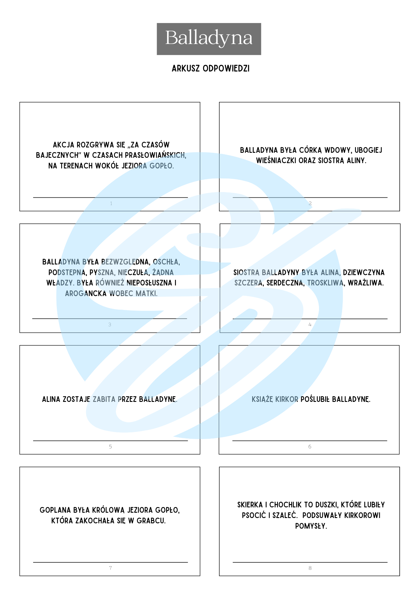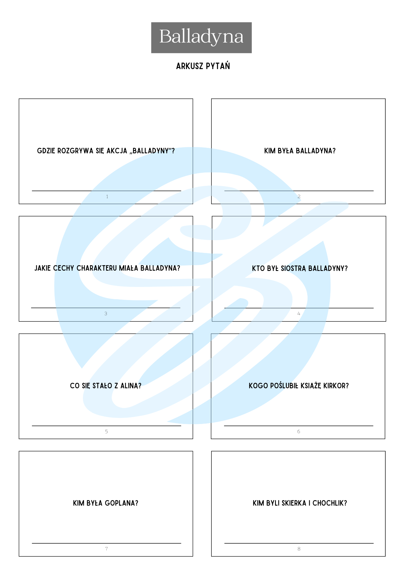 Szukasz angażującego sposobu na omawianie Balladyny Juliusza Słowackiego w szkole podstawowej? Nasz zestaw „Balladyna – Pytania i Odpowiedzi” to interaktywne karty pracy, które ułatwią uczniom przyswajanie treści lektury i zachęcą do aktywnego udziału w lekcji.
