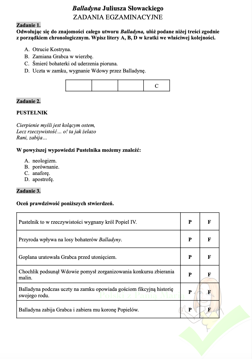 • kartę pracy z zadaniami egzaminacyjnymi dotyczącymi lektury,